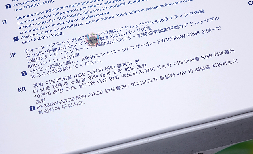 실버스톤 SST-PF360W 제품은 제품박스에서부터 화이트컨셉을 그대로 보여줍니다. 화이트색상의 제품이미지를 그대로 박스에 담고 있으며, RGB 어드레서블 지원으로 ASUS, ASRock, MSI, 기가바이트 4대 메이저 메인보드외에도 바이오스타의 RGB Sync까지 지원하죠. 그리고, 국내에서 현재 유통을 담당하는 STCOM의 스티커도 확인할 수 있습니다. 전면에 표기된 RGB 표기만 봤을 때는 메인보드로만 지원하는 것 같지만, 박스 측면에 제품 특징으로 제품 자체에서 지원하는 어드레서블 RGB 컨트롤러가 포함되어있다는 문구를 확인할 수 있어서, 메인보드와 상관없이도 RGB 효과를 볼 수 있다라는 것을 알 수 있고, 박스후면에는 제품의 기본사양과 제품 사이즈 그리고 방금 언급한 어드레서블 RGB 컨트롤러를 포함해 어드레서블 RGB 팬과 워터블록의 이미지도 추가로 확인할 수 있습니다.