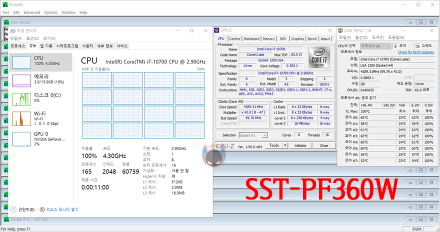 그럼, 이제 마지막으로 실버스톤 SST-PF360W 일체형 수랭쿨러의 냉각성능을 확인해봐야겠죠. 현재 일체형 수랭쿨러에서 최상급 라디에이터 길이는 SST-PF360W처럼 360mm입니다. 이보다 한 단계 아래가 280과 240mm 라디에이터인데, 실제로 240mm 라디에이터와 비교를 해봤습니다. 인텔 i7-10700 CPU를 전력해제 시켜서 4.3GHz 고정클럭으로 적용한 뒤 Prime 95를 10분간 실행해 CPU의 과부하상태에서 냉각성능을 확인해 본 결과, 실버스톤 SST-PF360W 일체형 수냉쿨러는 59.75℃, 240mm 라디에이터 일체형 수랭쿨러는 66.87℃로 약 6℃가량 실버스톤 SST-PF360W가 더 낮은 온도를 보여줬습니다. 이는 라디에이터 길이 비례에 따라서 냉각성능이 더 좋다라는 것을 그대로 보여주는 부분이고, IDLE와 LOAD 상태에서의 SST-PF360W 팬 소음까지 측정해 본 결과, 약 40dB(A)과 45dB(A)로 정숙하고 조용한 편이라 냉각성능과 소음 전체적으로 만족스럽다 느낄 수 있었습니다.