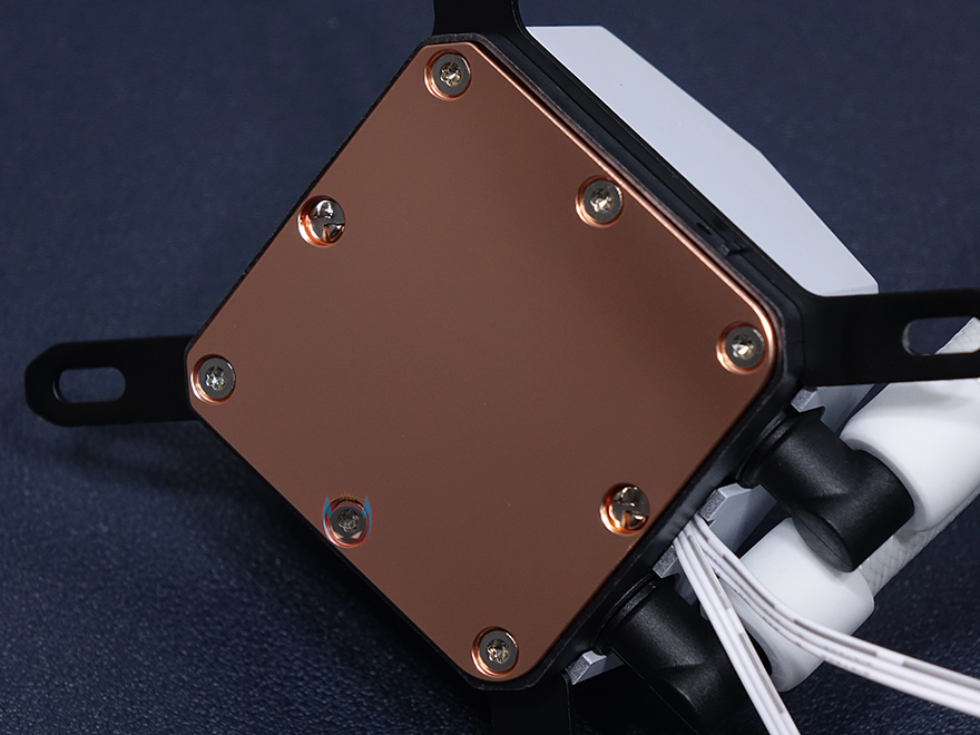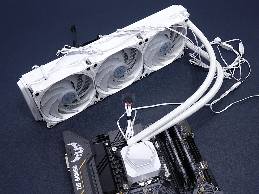 라디에이터와 워터블록을 연결하는 호스 튜브부분은 400mm 길이에 내부에 튜브자체의 재질은 고무재질이지만, 요즘은 마감으로 슬리빙처리를 대부분하고 있어서, SST-PF360W 역시 화이트색상에 맞춰 슬리빙처리를 깔끔하게 적용하고 있습니다. 또한, 양쪽 연결부의 마감도 누수가 발생하지 않게 잘 밴딩처리되어 있죠. 워터블록은 미러 아크릴을 사용해서 사용하지 않을 때는 내부가 보이지 않도록 하고, 사용시에는 내부에 적용된 실버스톤 로고가 보이도록 했습니다. 그리고, 펌프는 3핀 연결방식에 3400(±10%)RPM 작동속도를 가졌으며, RGB 라이팅효과를 위해 5V 어드레서블 케이블이 적용되어 있습니다. CPU와 맞닿는 베이스 부분은 구리재질 그대로 매끄럽게 래핑처리가 잘 되어있죠.