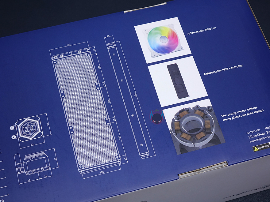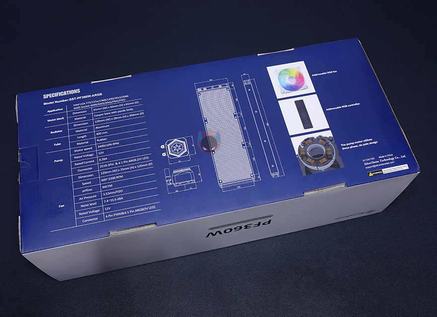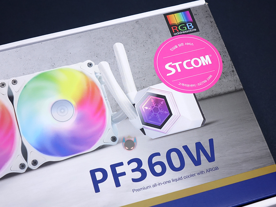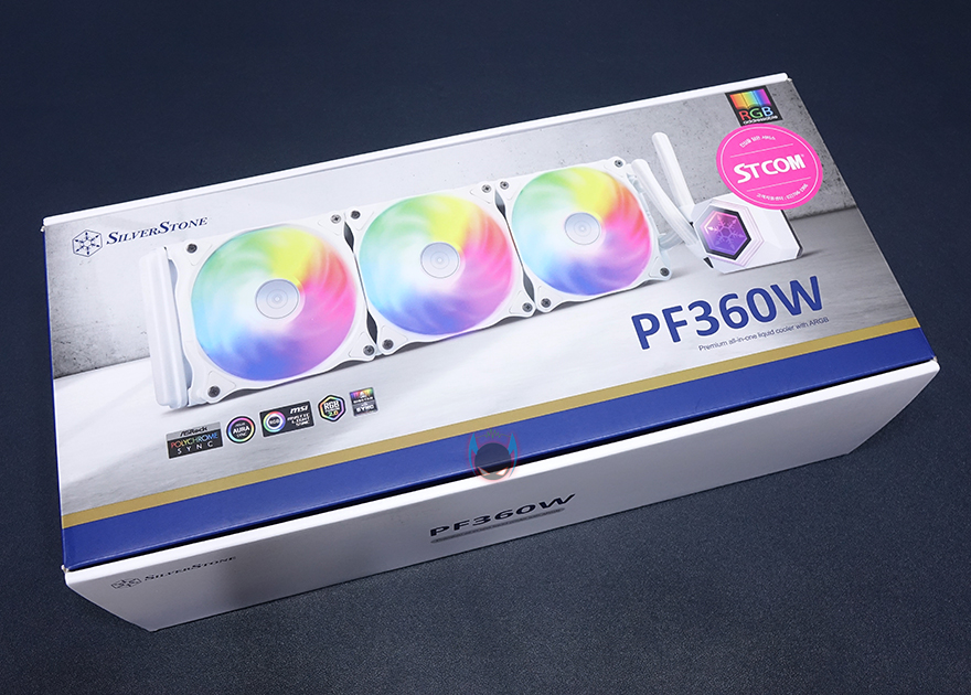 실버스톤 SST-PF360W 제품은 제품박스에서부터 화이트컨셉을 그대로 보여줍니다. 화이트색상의 제품이미지를 그대로 박스에 담고 있으며, RGB 어드레서블 지원으로 ASUS, ASRock, MSI, 기가바이트 4대 메이저 메인보드외에도 바이오스타의 RGB Sync까지 지원하죠. 그리고, 국내에서 현재 유통을 담당하는 STCOM의 스티커도 확인할 수 있습니다. 전면에 표기된 RGB 표기만 봤을 때는 메인보드로만 지원하는 것 같지만, 박스 측면에 제품 특징으로 제품 자체에서 지원하는 어드레서블 RGB 컨트롤러가 포함되어있다는 문구를 확인할 수 있어서, 메인보드와 상관없이도 RGB 효과를 볼 수 있다라는 것을 알 수 있고, 박스후면에는 제품의 기본사양과 제품 사이즈 그리고 방금 언급한 어드레서블 RGB 컨트롤러를 포함해 어드레서블 RGB 팬과 워터블록의 이미지도 추가로 확인할 수 있습니다.
