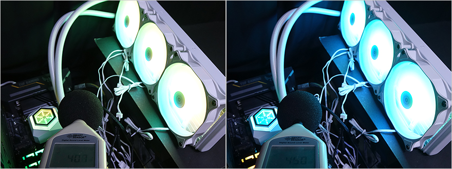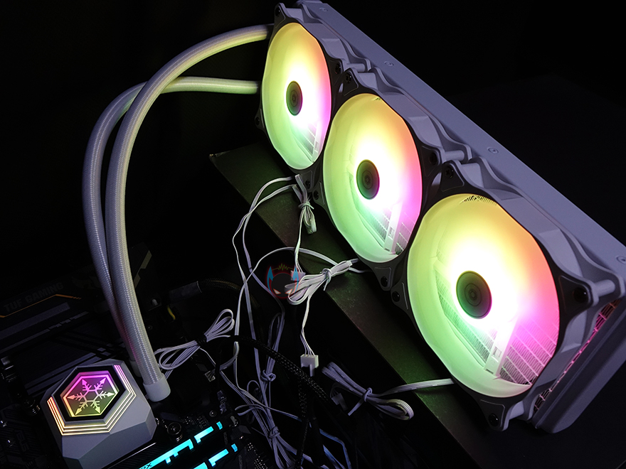 실버스톤 SST-PF360W 일체형 수랭쿨러 장착 후 PC를 켜면, 워터블록과 3개의 팬에서 라이팅효과를 볼 수 있는데, 메인보드에 5V 어드레서블 RGB헤더가 없어도 제공되는 자체 어드레서블 컨트롤러를 통해 다양한 모드와 색상전환, 밝기 조절을 할 수 있기 때문에, 꼭 메인보드의 RGB Sync까지 고려할 필요는 없겠습니다. 물론, PC 전체적으로 통일감있는 RGB효과를 원한다면 메인보드와 연동해야겠죠.