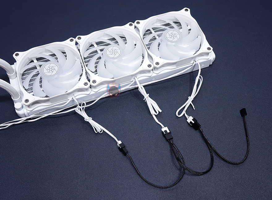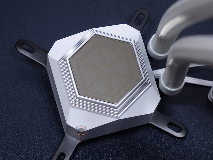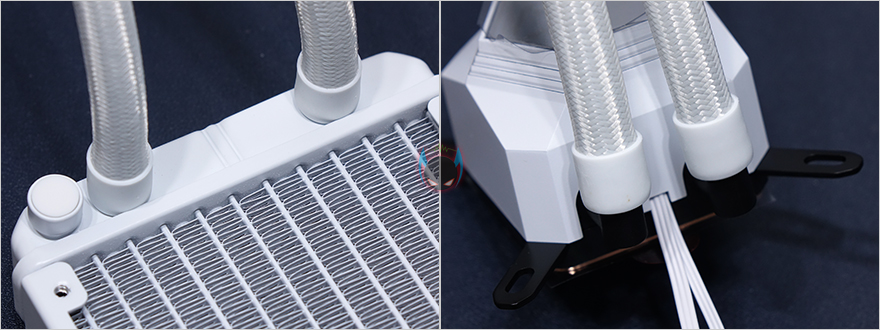 라디에이터와 워터블록을 연결하는 호스 튜브부분은 400mm 길이에 내부에 튜브자체의 재질은 고무재질이지만, 요즘은 마감으로 슬리빙처리를 대부분하고 있어서, SST-PF360W 역시 화이트색상에 맞춰 슬리빙처리를 깔끔하게 적용하고 있습니다. 또한, 양쪽 연결부의 마감도 누수가 발생하지 않게 잘 밴딩처리되어 있죠. 워터블록은 미러 아크릴을 사용해서 사용하지 않을 때는 내부가 보이지 않도록 하고, 사용시에는 내부에 적용된 실버스톤 로고가 보이도록 했습니다. 그리고, 펌프는 3핀 연결방식에 3400(±10%)RPM 작동속도를 가졌으며, RGB 라이팅효과를 위해 5V 어드레서블 케이블이 적용되어 있습니다. CPU와 맞닿는 베이스 부분은 구리재질 그대로 매끄럽게 래핑처리가 잘 되어있죠.