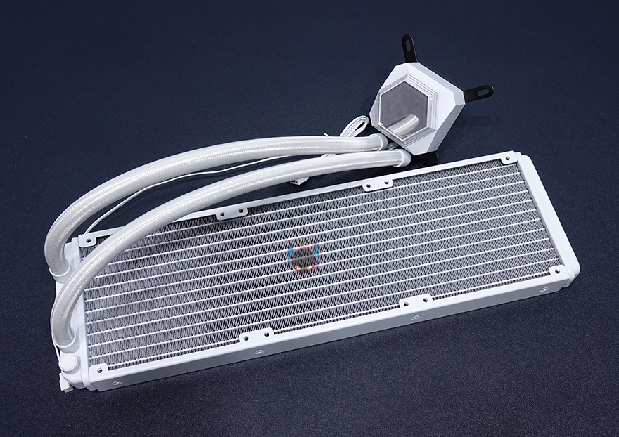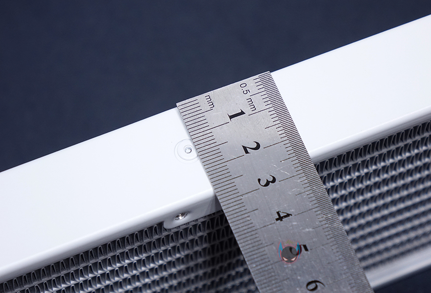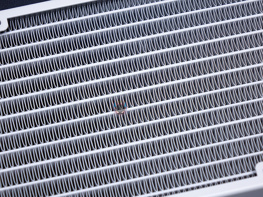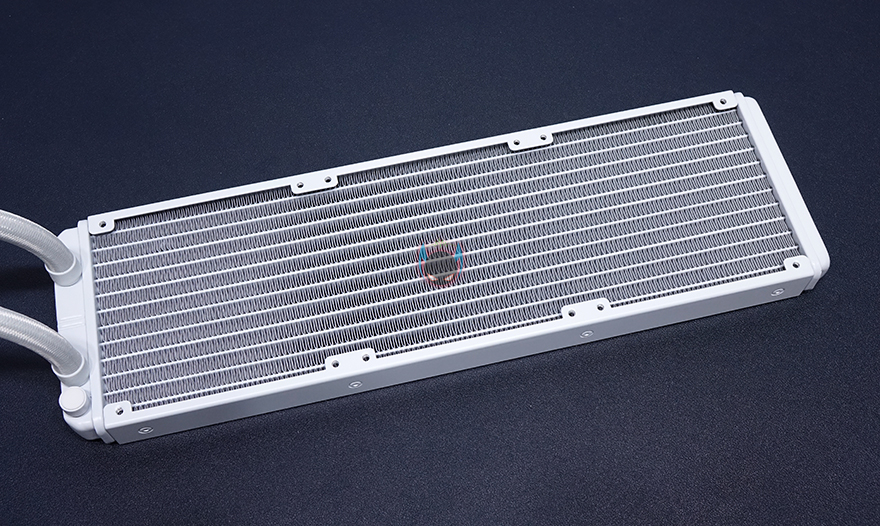 실버스톤 SST-PF360W 일체형 수랭쿨러 외형을 살펴보면, 극히 일부분을 제외하고 전체적으로 화이트색상을 적용하고 있습니다. 좀 더 자세히 살펴보면, 라디에이터부분은 전체적으로 화이트색상 도색마감이 잘 되어있으며, 특히 방열핀부분이 일정한 간격으로 휨 부분없이 깔끔하게 잘 처리되어 있습니다. 총 길이는 394mm, 두께는 28mm로 120mm 팬을 3개까지 장착합니다. 물론, 추가로 팬 3개를 더 사용하면 앞뒤로 듀얼 팬을 갖출 수 있죠.