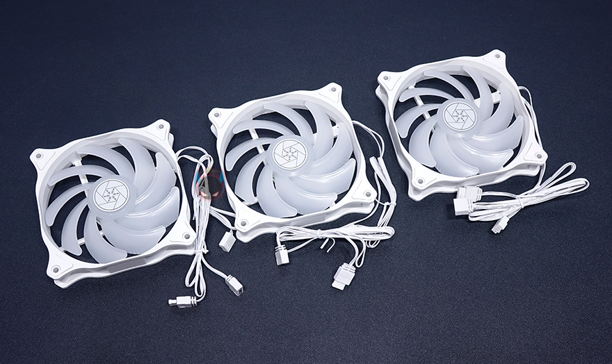 그리고, 기본 제공되는 3개의 120mm 팬 역시 프레임부터 블레이드(날개), 케이블까지 화이트색상으로 적용을 했으며, 블레이드부분은 RGB효과를 위해 반투명으로 처리되어있으며, 제조사마다 나름 풍량 최대화를 위해 차별적인 무늬를 적용하듯 실버스톤도 블레이드 부분에 차별적인 무늬 디자인을 적용했습니다. 그리고, 팬은 PWM(4핀) 연결방식으로 600~2200RPM 속도범위를 가지고 있으며, RGB효과를 위한 5V 어드레서블 케이블도 적용되어 있죠. 물론, 팬을 서로 연결해서 하나로 RGB 효과를 볼 수 있게 암수를 함께 갖추고 있습니다.