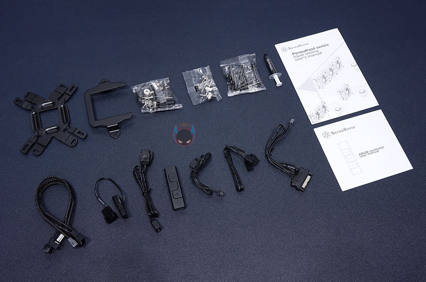 제품 포장은 기존의 제품들이나 경쟁사들 제품들과 큰 차이없이 기본적인 포장방식으로 포장을 했으며, SST-PF360W 일체형 수랭쿨러를 포함해 360mm 라디에이터가 사용되기 때문에 120mm 팬 3개를 비롯해 백플레이트, AMD용 브라켓, 용도별로 비닐 포장된 각 종 스크류 등의 부속품, 소량의 써멀컴파운드, 3개의 팬을 하나로 연결시켜주는 3 in 1, 2 in 1 팬 케이블 및 어드레서블 케이블, 어드레서블 RGB 컨트롤러, 컨트롤러 전원 케이블, 제품설명서로 제품구성을 이루고 있습니다.