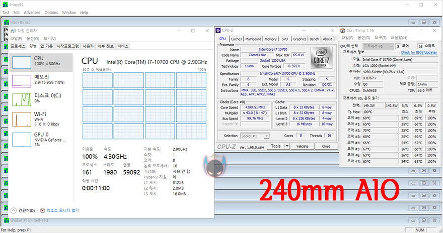그럼, 이제 마지막으로 실버스톤 SST-PF360W 일체형 수랭쿨러의 냉각성능을 확인해봐야겠죠. 현재 일체형 수랭쿨러에서 최상급 라디에이터 길이는 SST-PF360W처럼 360mm입니다. 이보다 한 단계 아래가 280과 240mm 라디에이터인데, 실제로 240mm 라디에이터와 비교를 해봤습니다. 인텔 i7-10700 CPU를 전력해제 시켜서 4.3GHz 고정클럭으로 적용한 뒤 Prime 95를 10분간 실행해 CPU의 과부하상태에서 냉각성능을 확인해 본 결과, 실버스톤 SST-PF360W 일체형 수냉쿨러는 59.75℃, 240mm 라디에이터 일체형 수랭쿨러는 66.87℃로 약 6℃가량 실버스톤 SST-PF360W가 더 낮은 온도를 보여줬습니다. 이는 라디에이터 길이 비례에 따라서 냉각성능이 더 좋다라는 것을 그대로 보여주는 부분이고, IDLE와 LOAD 상태에서의 SST-PF360W 팬 소음까지 측정해 본 결과, 약 40dB(A)과 45dB(A)로 정숙하고 조용한 편이라 냉각성능과 소음 전체적으로 만족스럽다 느낄 수 있었습니다.