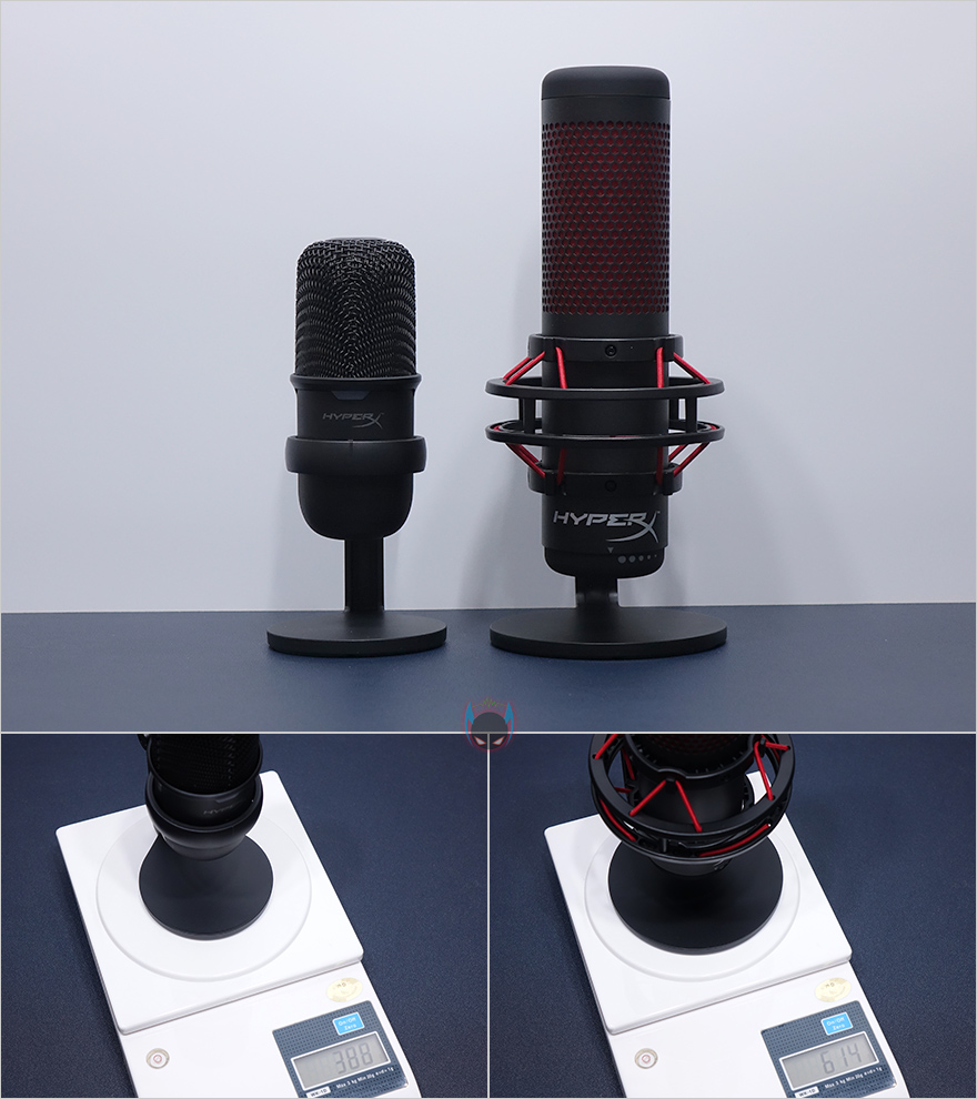 그럼, HyperX SoloCast USB 콘덴서 마이크 외형을 한 번 살펴보죠. 전체적인 색상은 블랙이며, 작아진 사이즈만큼이나 심플한 디자인을 가졌습니다. 상위모델인 QuadCast와 크기 비교를 해봐도 상당히 사이즈가 작아졌다라는 것을 실감할 수 있죠. 여기에 무게도 약 40%가량으로 가벼워졌습니다. 그래서, QuadCast처럼 진동방지의 쇼크마운트는 적용되어 있지 않습니다.