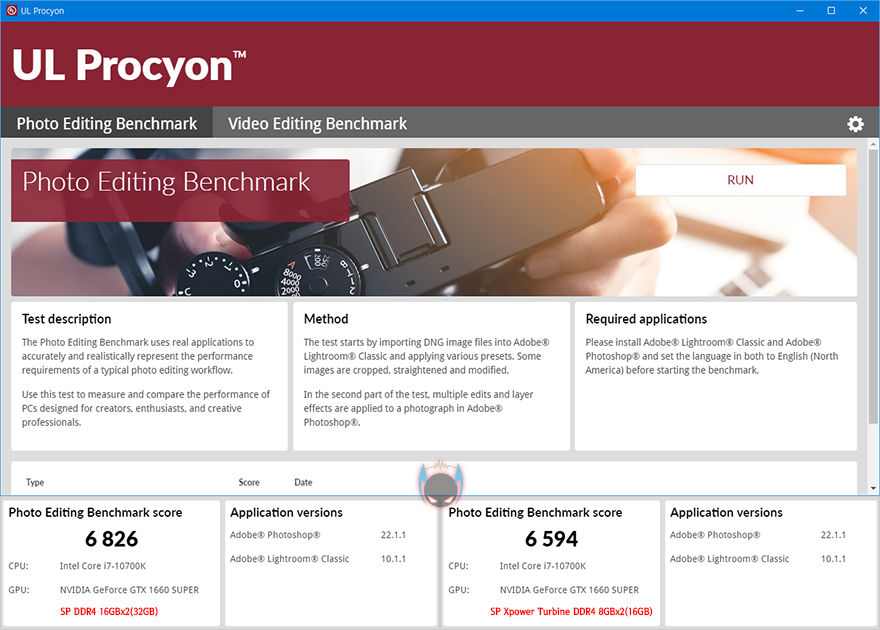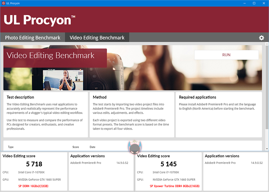 그래서, 메모리 용량이 커질수록 영향을 많이 받는 환경에서 성능 확인을 해보는데, 대표적인게 3DMark로 잘 알려진 UL Benchmark의 Procyon 프로그램입니다. 이 프로그램은 사진이나 영상작업으로 가장 많이 사용되고 있는 Adobe의 Photoshop, Lightroom, Premiere Pro 프로그램을 실제 작업환경으로 실행시켜서 점수로 변환해주는 최신 벤치마크 프로그램으로, Photo와 Video 부분은 각각 30분가량, 1시간 30분가량 실행한 결과, 메모리 용량이 2배 더 많은 단일 DDR4 16 RAM이 점수가 더 높은 것을 확인할 수 있습니다.