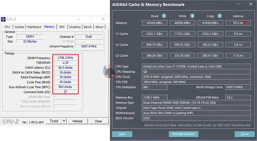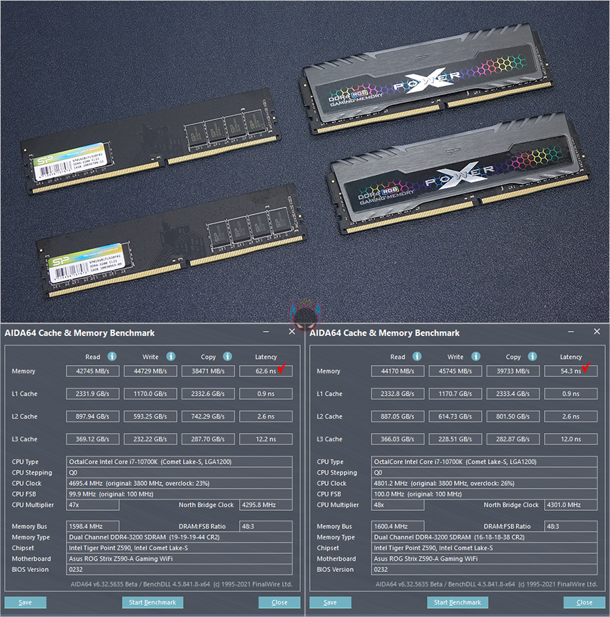 마지막으로 위에서 확인했듯이 실리콘파워 단일 DDR4 16GB 메모리는 일명 오버클럭(Overclock) 값을 저장한 X.M.P 프로파일이 적용되어 있지 않습니다. 하지만, 모든 메모리는 오버클럭이 가능하기 때문에, 이 제품 역시 X.M.P 프로파일에 오버클럭 값 저장할 때 적용하는 DDR4 최대전압 1.35V 기준으로 오버클럭을 해봤습니다. 결과는 3500MHz 클럭까지 작동되는 것을 확인할 수 있었고, 램 타이밍도 18-19-19-43 값으로 적용할 수 있었고, 성능이 더 향상되는 것까지 확인할 수 있었습니다. 물론, 요즘 게이밍 메모리 제품들은 더 높은 오버클럭 값을 가지고 있는 제품들도 있어서 높은 클럭 값은 아니지만, 그래도, 단일 16GB라는 점과 방열판이 없는 기본 형태의 메모리에서 추가 오버클럭이 된다라는 점은 매력이 있습니다.