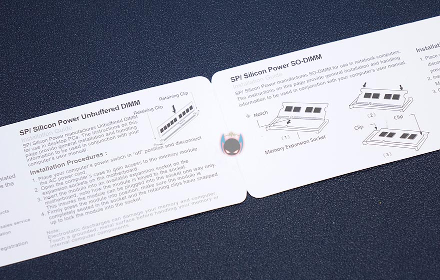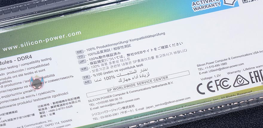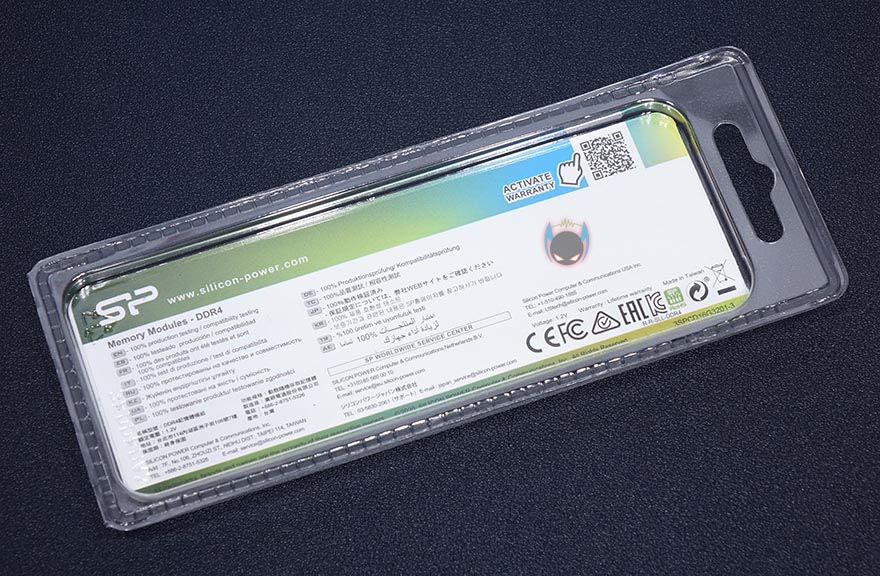 실리콘파워 DDR4 16GB 단일 RAM 역시 Aircool과 마찬가지로 투명-캡 방식으로 포장이 되어있어서, 개봉을 하지 않아도 구입 전에 제품 실물을 미리 볼 수 있습니다. 팩키지 전면에는 추가로 클럭과 용량 표기를 확인할 수 있는데, 참고로, 이 제품은 2133/2400/2666/3200MHz 총 4가지 클럭 제품으로 나왔으며, 용량은 단일로 최대 32GB까지 있습니다. 그리고, 팩키지 후면에는 한국어를 포함해 각 나라별 언어로 호환성과 보증 문구를 표기해놨죠. 제품 구성도 간단하게 메모리만 갖추고 있으며, 팩키지 종이의 안쪽에는 PC메모리(UDIMM)과 SODIMM 메모리의 장착법 설명을 담고 있습니다.