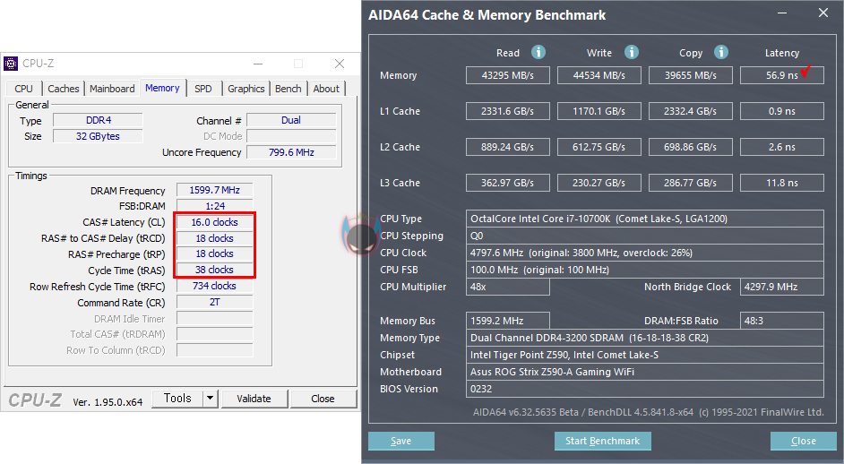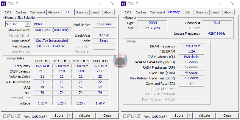 직접, 실리콘파워 DDR4 16GB 단일메모리를 사용해보면, 16GB 2개를 사용했기 때문에 총 32GB 용량이고, CPU-Z를 통해 기본 작동클럭을 확인해보면, 1.2V 전압에 3200MHz으로 작동되는 것을 확인할 수 있습니다. 별도의 X.M.P 프로파일은 적용되어 있지 않죠. 그리고, 램 타이밍 값은 19-19-19-44로 자사의 동급 클럭을 가진 Xpower Turbine DDR4 16GB(8GBx2)와 성능 비교를 해보면, 당연히 레이턴시(Latency)가 더 긴 것을 확인할 수 있습니다.