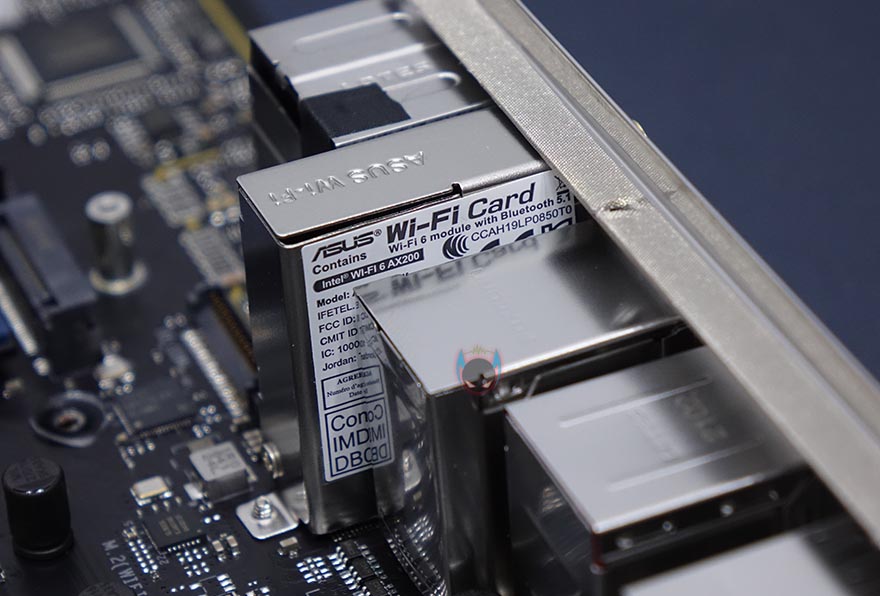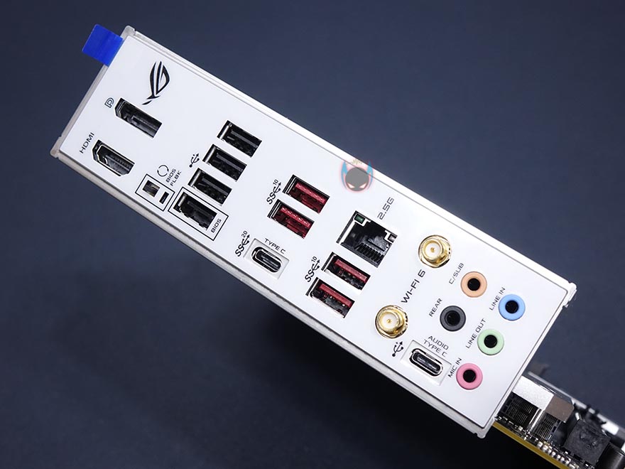 레이아웃 끝으로, 내장 오디오 부분은 기존 제품들처럼 독립PCB 구분으로 처리를 했으며, 7.1채널 서라운드 사운드까지 지원하며, 백패널 I/O 부분 같은경우 쉴드가 일체형으로 적용된 형태에 DP 1.4버전, HDMI 2.0 포트를 시작으로 바이오스 플래시-백 버튼 및 포트(USB 2.0), USB 2.0 포트 3개, USB 3.2 Gen2 타입A 포트 4개(레드), USB 3.2 Gen2x2 타입C 포트 1개, 2.5Gb 랜포트, 오디오 USB 2.0 타입C 포트, 기본 오디오 포트를 구성하고 있습니다. 그리고, 이미 언급한대로 이번 모델에선 기본적으로 무선 와이파이 모듈을 갖추고 있는데, Wi-Fi 6와 블루투스 5.1 지원을 함께 갖추고 있습니다.