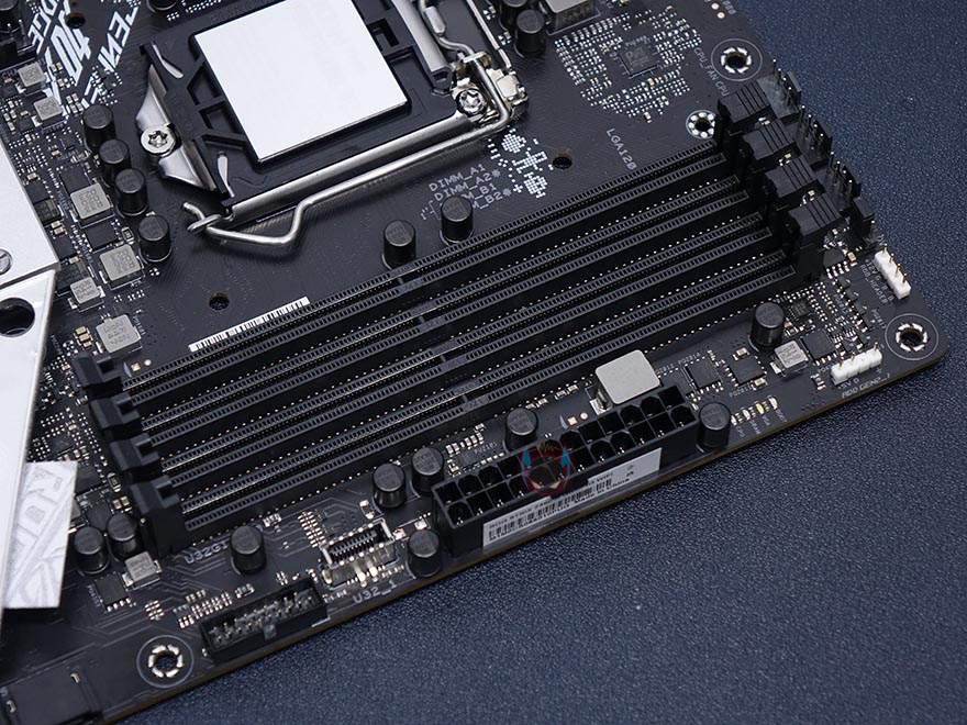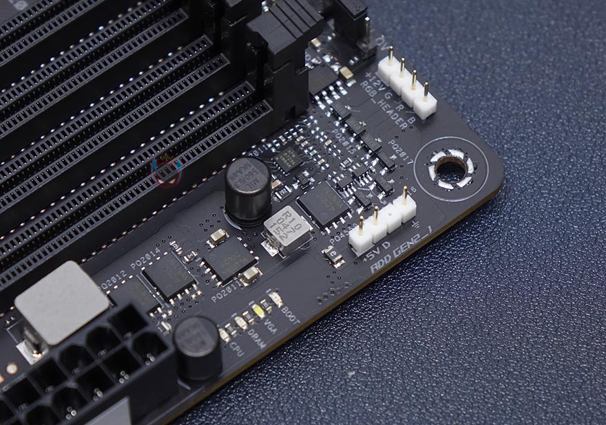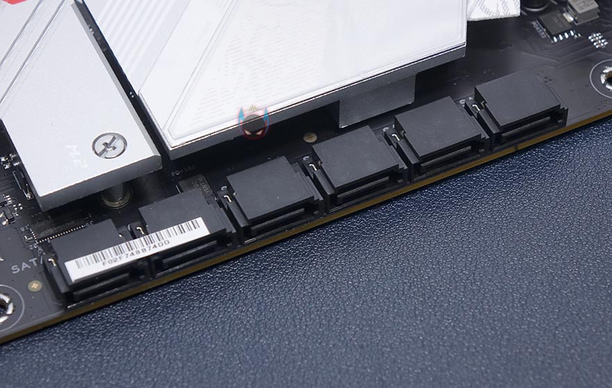 메모리 슬롯은 4개 구성으로 이전 세대 모델과 마찬가지로 최대 128GB용량까지 갖출 수 있으며, 클럭범위는 최대 5333MHz으로 더 넓어졌습니다. 슬롯 오른쪽 주변에는 12V와 5V RGB 헤더와 부팅 시 CPU, VGA, RAM 상태를 체크할 수 있는 Q-LED가 배치되어 있으며, 왼쪽 주변에는 USB 3.2 Gen1 타입A 내부 헤더와 타입C 내부 헤더가 배치되어 있습니다. 최근 PC케이스에 USB 3.2 타입C 포트가 배치되는 경우가 점점 늘어나고 있죠. 그리고, 그대로 아랫쪽 메인보드 맨 오른쪽에는 S-ATA 6Gb/s 포트가 6개 배치되어있는데, 흔히 보는 2단 구성이 아닌 1단 즉 일렬로 배치를 했습니다. 이렇게 구성하면 아무래도 케이블 연결/분리할 때 한결 편리하죠.