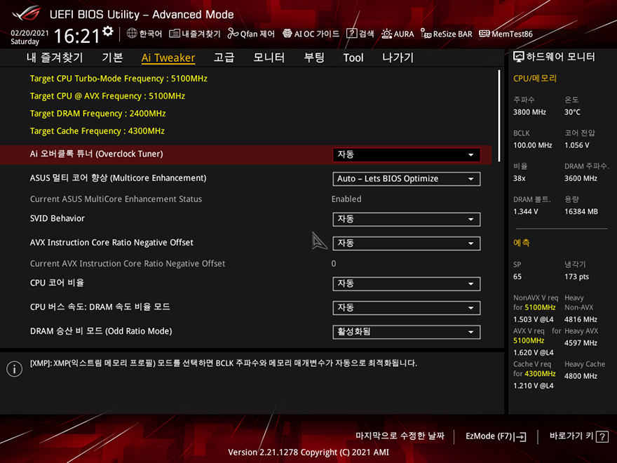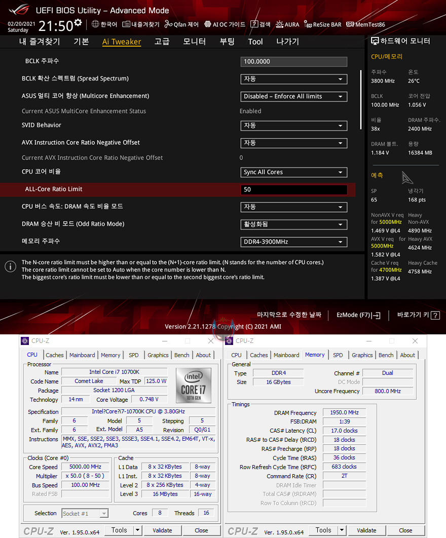 ASUS ROG Strix Z509-A Gaming WiFi 메인보드는 Z590 칩셋의 메인보드이기 때문에 CPU와 메모리 오버클럭을 지원합니다. 참고로, 인텔 같은경우 숫자뒤에 K가 붙은 CPU, 그리고 Z로 시작하는 숫자에서 오버클럭을 지원하죠. 오버클럭 설정은 기존 제품들과 마찬가지로 CMOS-Ai Tweaker에서 할 수 있으며, CPU수율 그리고, 사용하는 PC의 냉각솔루션 환경에 따라 사용자가 최적의 값을 찾아야 합니다. 아직 인텔 11세대 CPU가 출시되지 않았기 때문에, 여기에선 간단히 10세대 CPU와 메모리 오버클럭 지원여부만 확인을 했습니다.