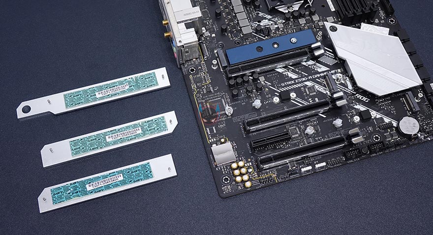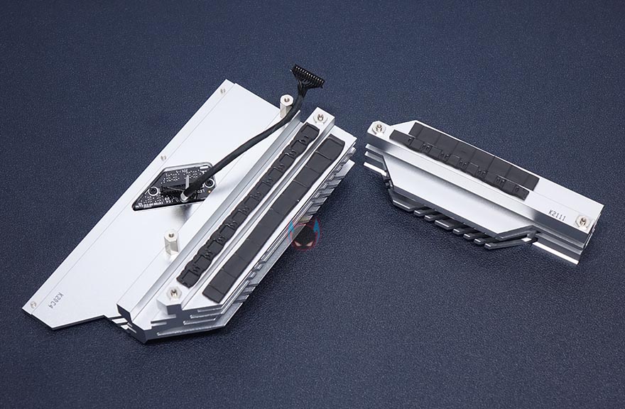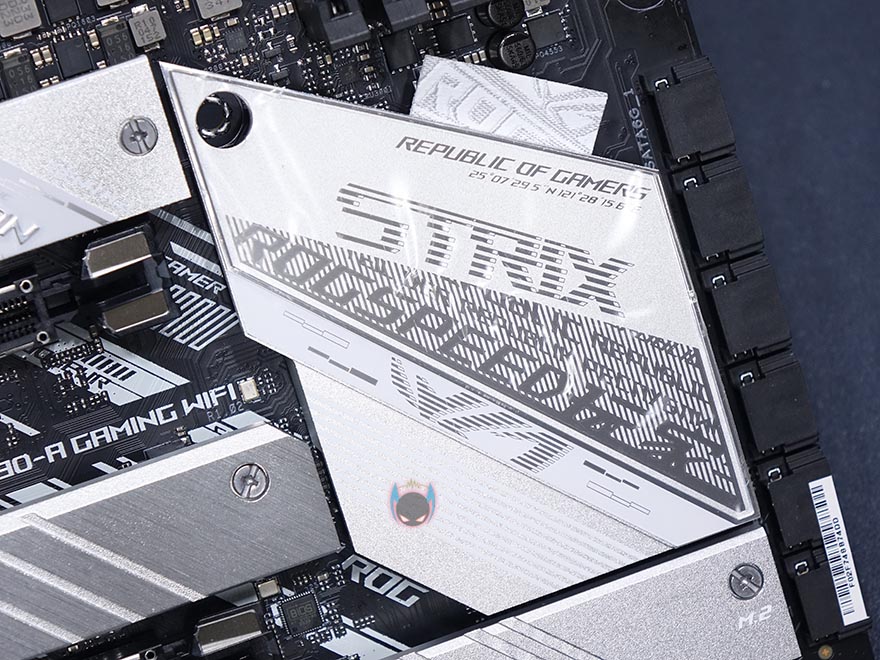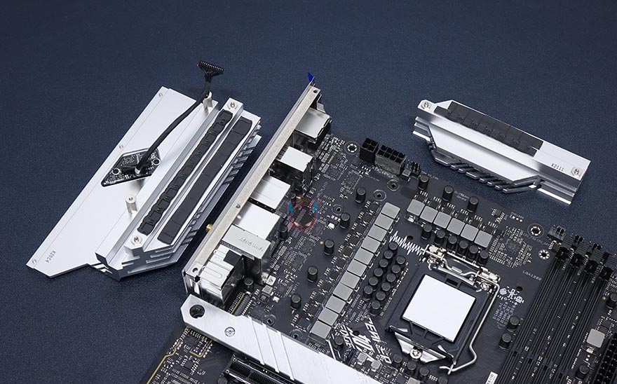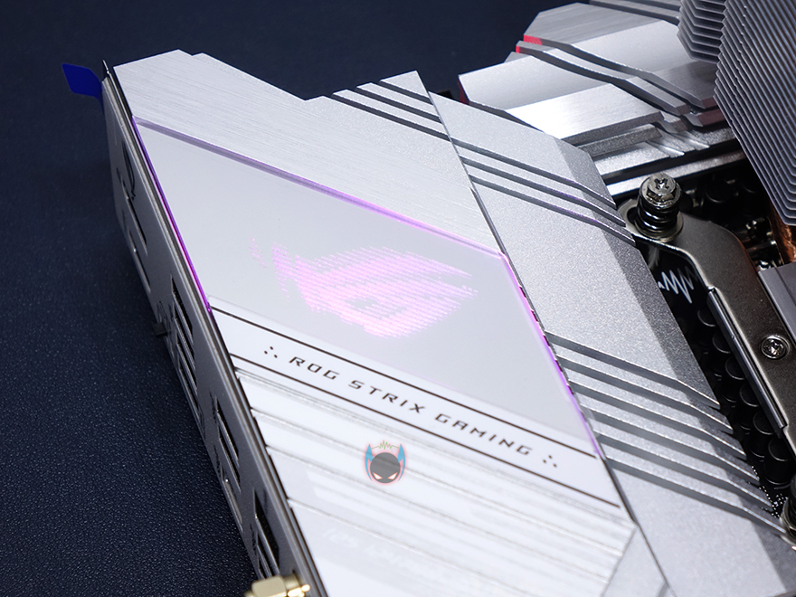 부위별로 좀 더 자세히 살펴보면, 일단 CPU 소켓 주변에 배치되는 전원부 같은경우 우선 히트싱크를 분리하는데, 이번 ROG Strix Z590-A Gaming WiFi 메인보드는 백패널 방향의 아머(Armor)와 히트싱크가 일체형입니다. 즉, 메탈재질이라는거죠. 이전 세대 ROG Strix Z490-A 모델에선 아머(Armor)가 플라스틱재질로 단순 커버 역할만 했죠. 그리고, 전원부 히트싱크에는 모두 써멀패드가 기본 부착되어 있으며, 아머부분의 ROG 로고에 라이팅효과를 위해 히트싱크 안쪽에 LED PCB기판이 적용된 것을 확인할 수 있습니다. 물론, 분리도 가능합니다. 참고로 외부쪽 로고부분은 미러-아크릴입니다.
