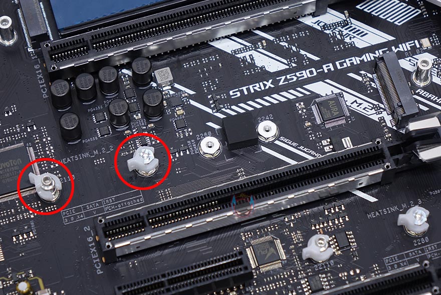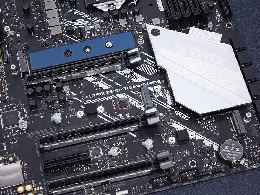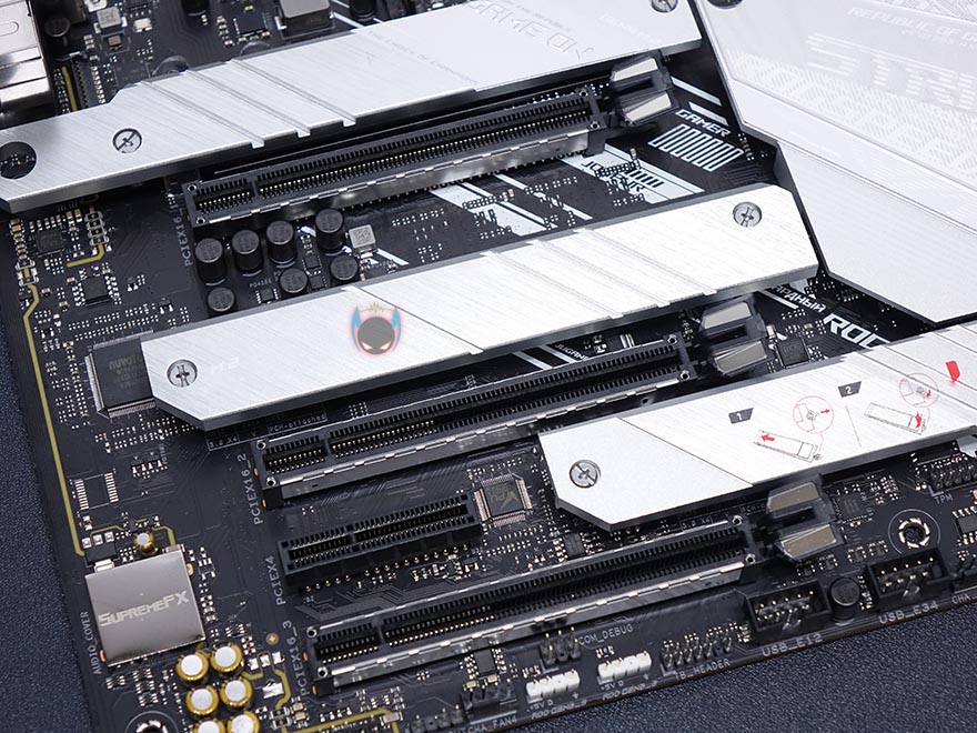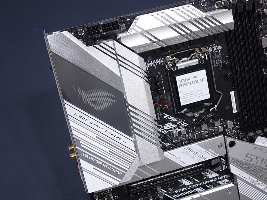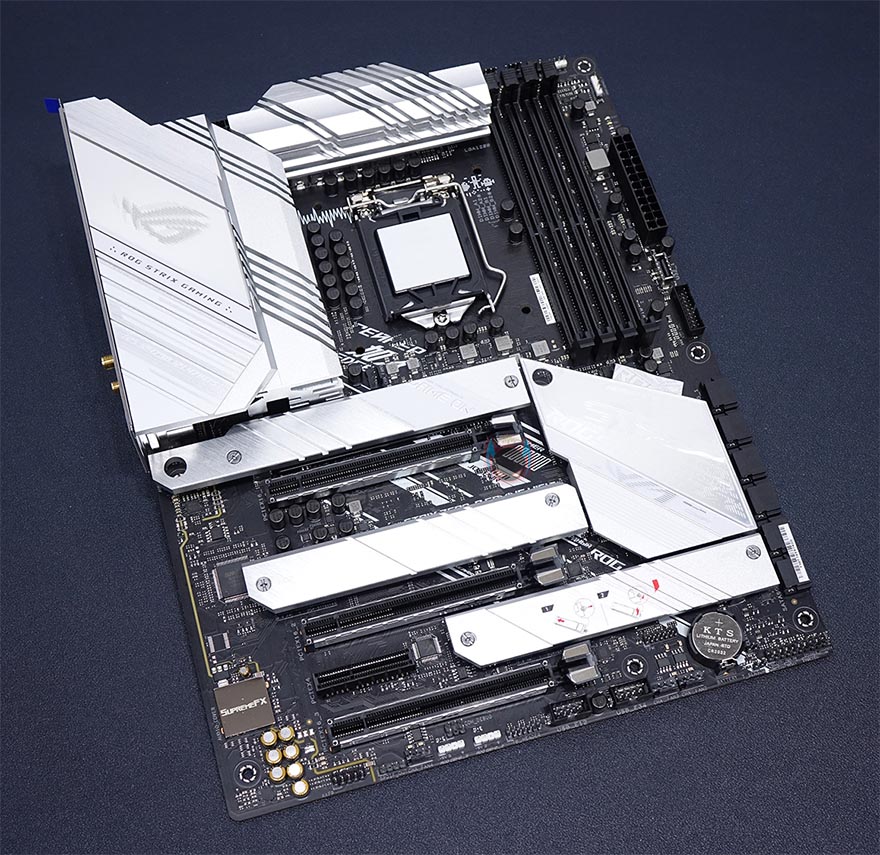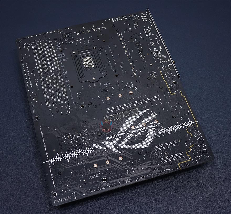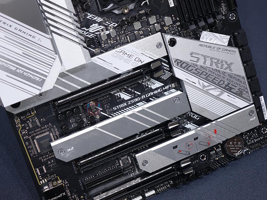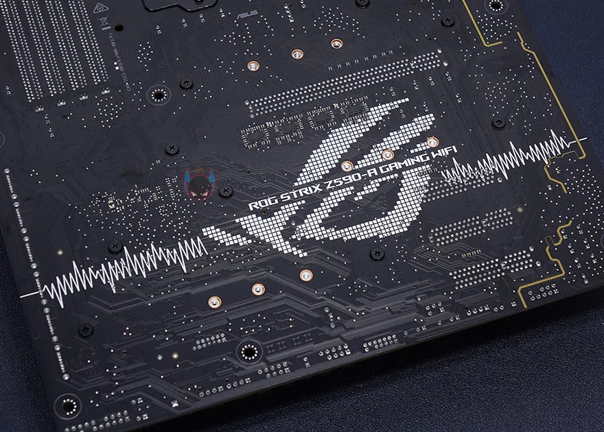 ASUS ROG Strix Z590-A Gaming WiFi 메인보드 레이아웃을 살펴보면, 역시 가장 먼저 눈에 띄는 부분은 ROG Strix A시리즈의 컨셉 화이트&실버 색상의 아머(Armor) 및 히트싱크죠. 특히, 이번 모델은 이전 세대와 달리 M.2 SSD를 장착하는 모든 슬롯 위치에 히트싱크를 적용했습니다. 뒤에서 다시 확인하겠지만, M.2 SSD슬롯도 1개가 더 늘어 총 3개까지 지원하죠. 또한, 이번 모델은 PCB기판에도 신겨을 써서, 후면에 큼지막한 ROG 로고까지 새겨놨습니다.