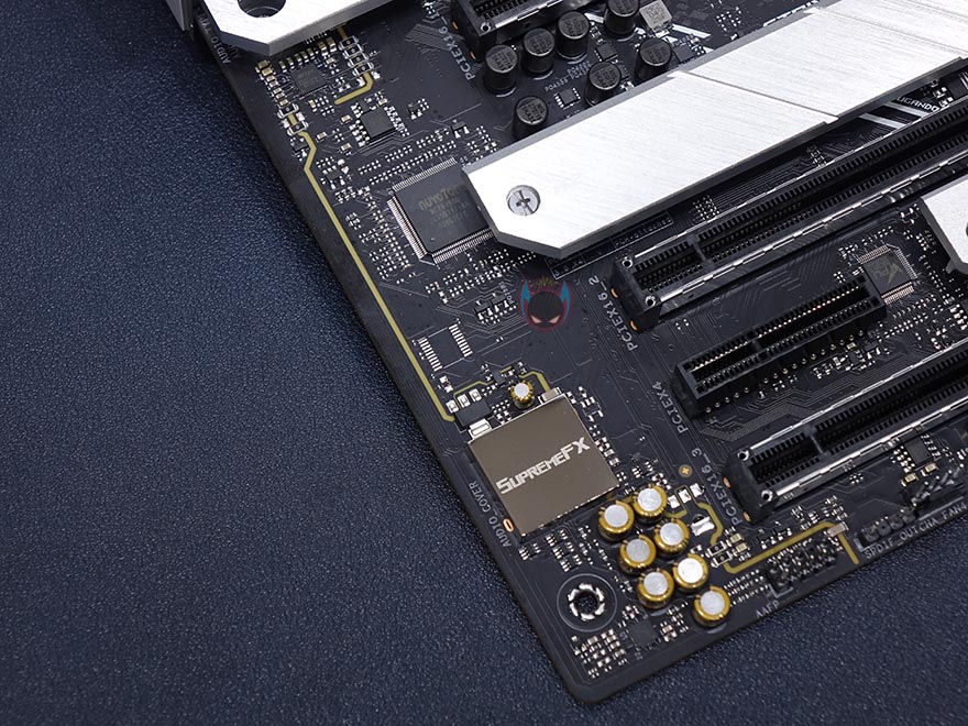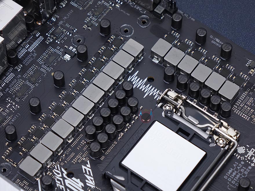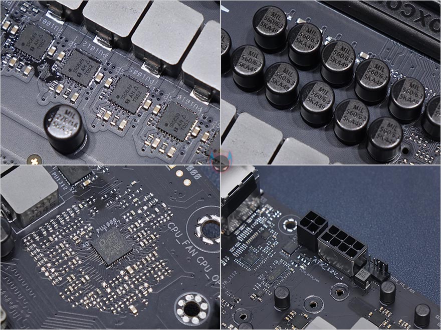 전원부 구성은 총 16(14+2)페이즈 구성으로 Vishay사의 최대 50A VRPower Dr.MOS 모스펫을 적용해 디지털 전원부를 갖추고 있습니다. 참고로, 이전 세대보다 2페이즈가 더 늘어난겁니다. 한가지 눈에 띄는 점은 캐패시터가 ASUS TUF 메인보드에 사용되는 제품으로 사용되었는데, 이미 잘 알려진대로 TUF 메인보드들은 미국방성 환경테스트를 통과해서 나오죠. 그리고, 디지털 전원부이기 때문에 ASUS PWM 컨트롤 DIGI+ 칩셋이 당연히 적용되어 있으며, ATX 보조전원은 4핀과 8핀 2개로 구성되었는데, 8핀 같은경우 PCI슬롯에 내구성 강화로 적용되는 스틸아머 디자인을 적용했습니다.