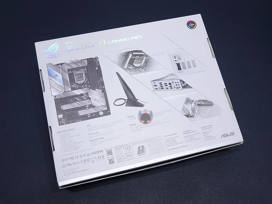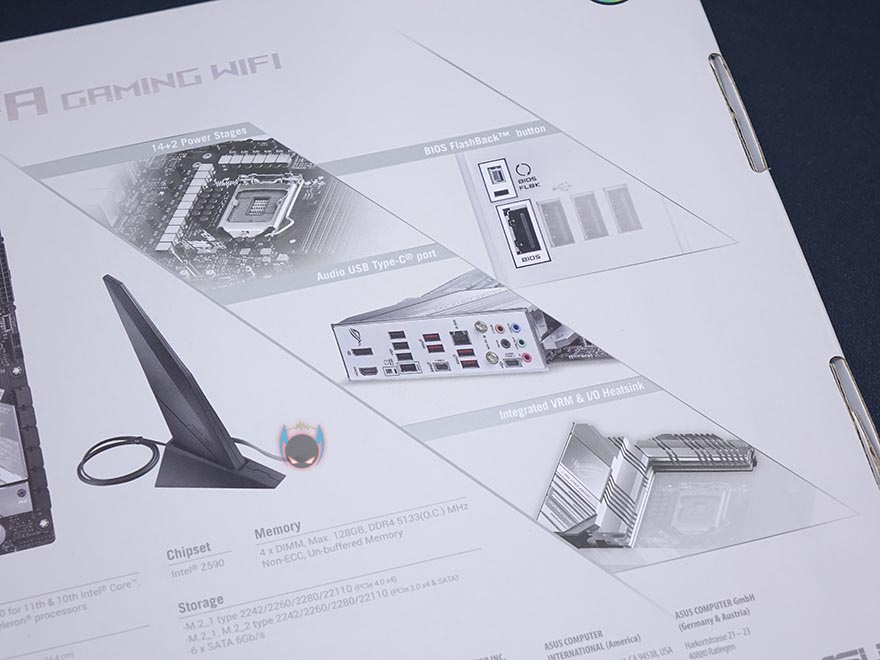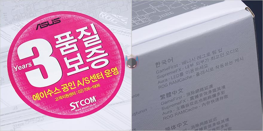 제품박스는 이전 세대인 ROG Strix Z490-A Gaming 모델부터 화이트색상을 배경으로 적용하기 시작했는데, 이번에도 그 컨셉을 이어갑니다. 모델명은 빛 반사에 따라서 색상이 변화는 홀로그램식으로 처리를 해놨으며, 국내 정식 수입사 중 한 곳인 STCOM의 3년 무상보증 스피커를 확인할 수 있고, 박스 측면에 간략하게 제품 특징 일부를 한국어로 표기해놨죠. 그리고, 박스 후면에는 제품의 풀-샷 이미지와 함께 이전 세대 모델과 달리 기본적으로 와이파이 구성이 포함된 것을 미리 알 수 있고, 추가적인 제품 특징으로 전원부와 USB 타입C포트 지원, 바이오스 플래시-백 버튼을 언급하고 있습니다.
