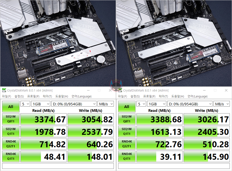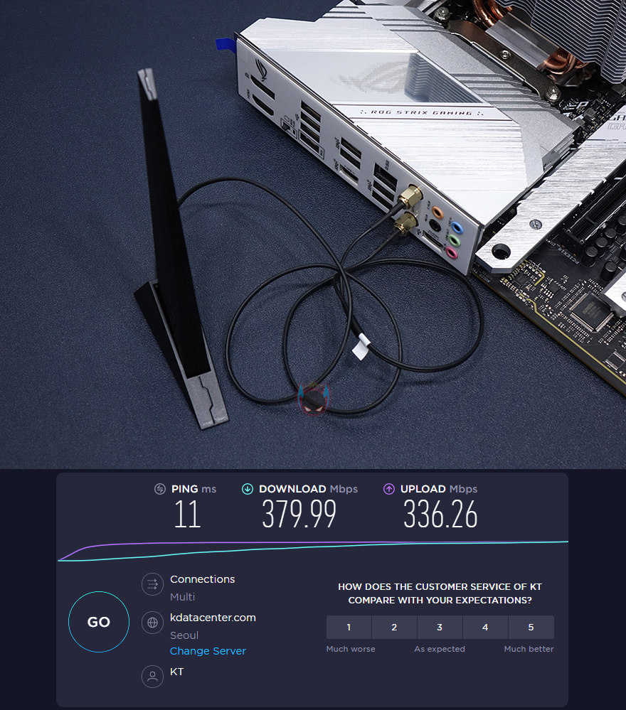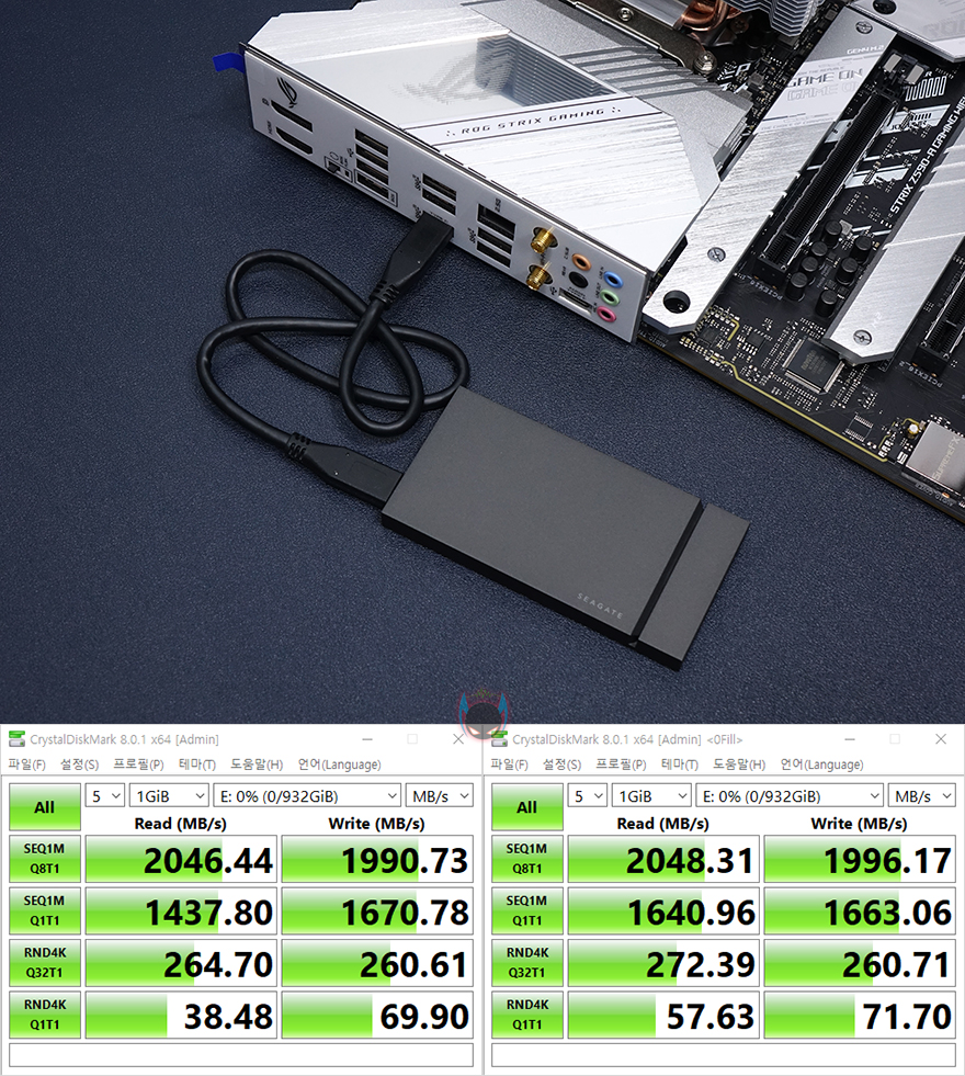 끝으로, 추가적인 부품 지원에 대한 성능도 확인해봤는데, 일단 M.2 SSD 같은경우 11세대 CPU를 사용하지 않으면, PCIe3.0x4레인으로 최대 작동하기 때문에, 2번과 3번 슬롯에만 M.2 SSD(NVMe)를 장착해서 확인해본 결과, PCIe3.0x4레인으로 낼 수 있는 3,000MB/s대 읽기/속도를 확인할 수 있었습니다. 그리고, 백패널 I/O 포트에서 USB 3.2 Gen2x2 타입C 포트를 확인했었죠? 드물지만 현재 외장SSD 제품에서도 최신버전으로 USB 3.2 Gen2x2까지 지원하는 모델이 나오기 시작해서, 연결 후 확인해 본 결과, 스펙상의 속도 2,000MB/s대로 나오는 것을 확인할 수 있었습니다. USB 3.2 Gen2x2 지원의 외장 SSD를 가지고 있는 소비자들에겐 반가운 점이라 할 수 있겠고, 마지막으로 듀얼밴드의 무선 Wi-Fi 6 지원도 5GHz로 속도측정해 본 결과 현재 제가 사용하고 있는 유선 500Mbps 속도에 낼 수 있는 무선 300Mbps까지 잘 나오는 것을 확인할 수 있었습니다. 더 빠른 인터넷속도를 사용하는 사용자라면 당연히 더 높은 속도가 나오니, 이제는 꼭 데스크탑PC를 유선으로 연결해서 사용할 필요는 없겠습니다.