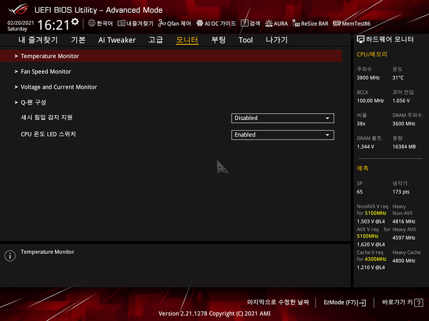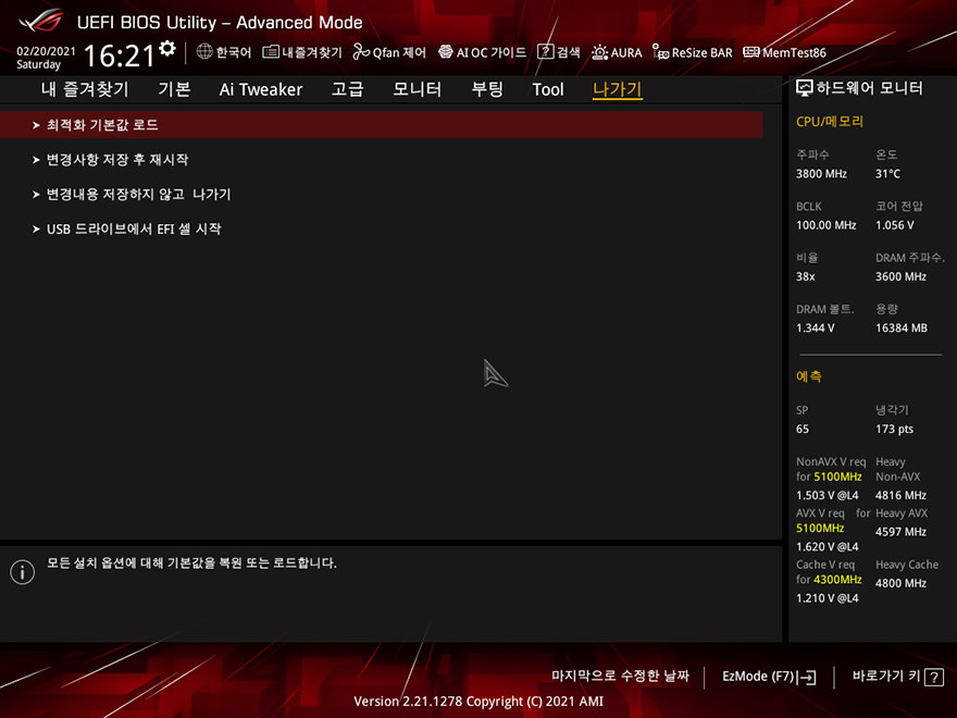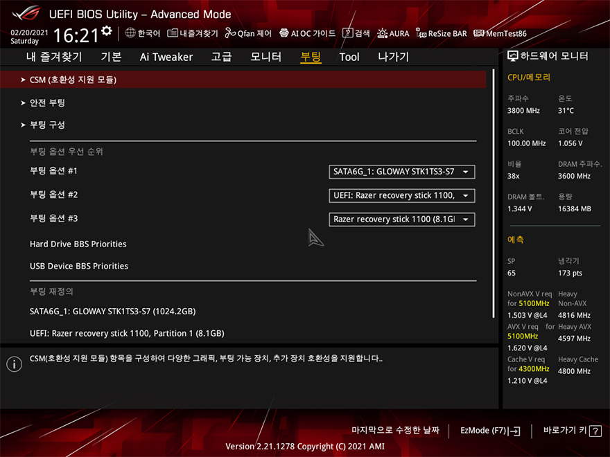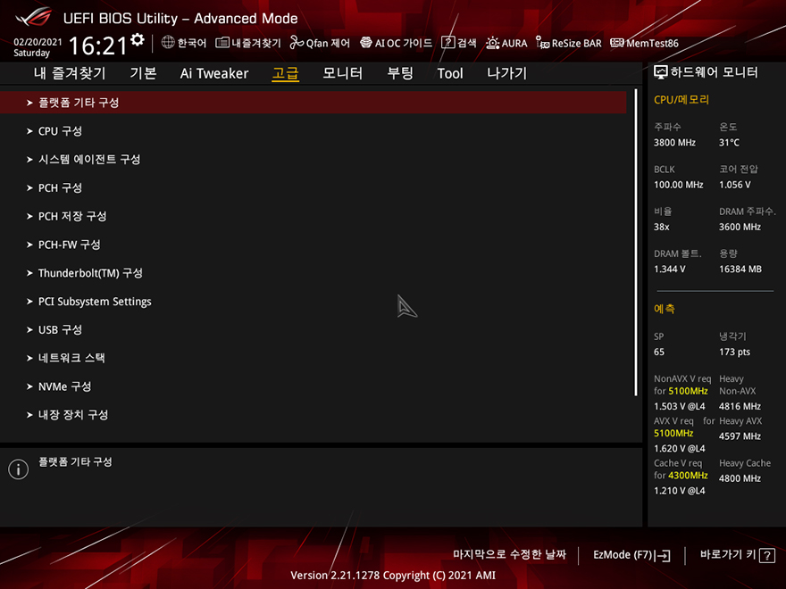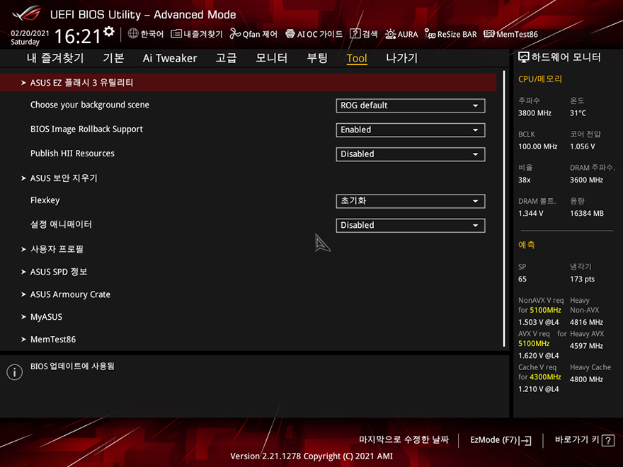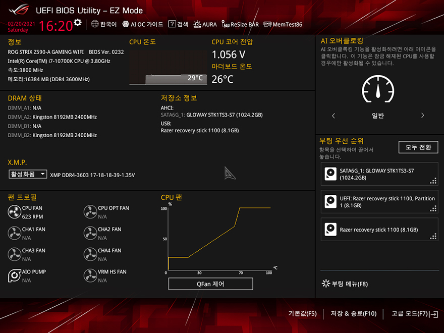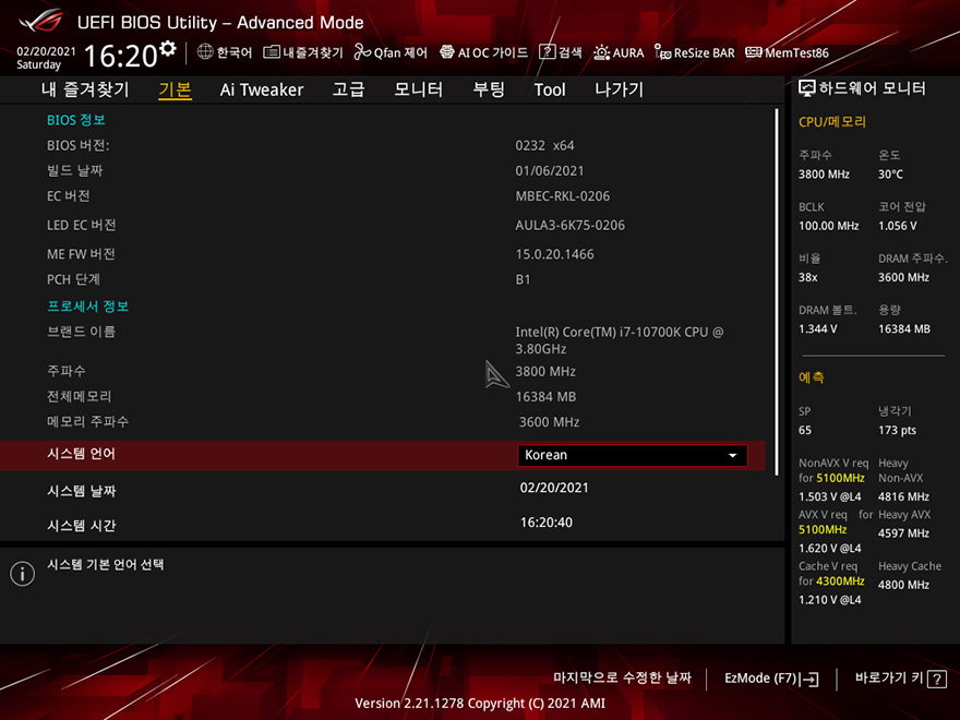 직접, ASUS ROG Strix Z590-A Gaming WiFi 메인보드를 사용해봐야겠죠?! 아직까지 인텔 11세대 CPU가 출시되지 않은 상황이기 때문에, 이전 세대인 10세대 i7-10700K CPU를 사용했으며, RGB라이팅효과는 이미 언급한대로 로고부분에만 적용되어 있습니다. CMOS 메뉴는 기존 제품들과 마찬가지로 F7키를 통해 EZ Mode와 Advanced Mode로 전환할 수 있고, 메뉴도 큰 변화는 없습니다. 참고로, 바이오스 역시 이제 출시된 모델이기 때문에, 기본 바이오스 외에 최신 버전은 아직 없습니다.