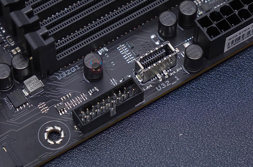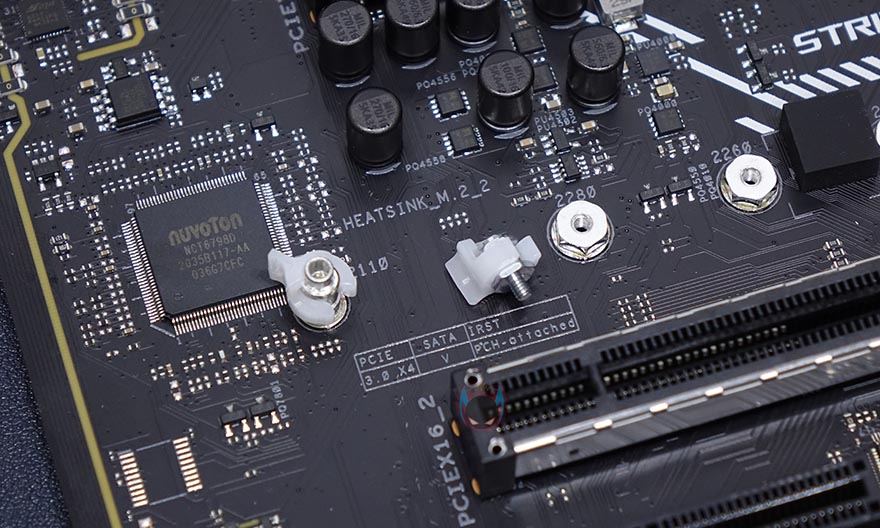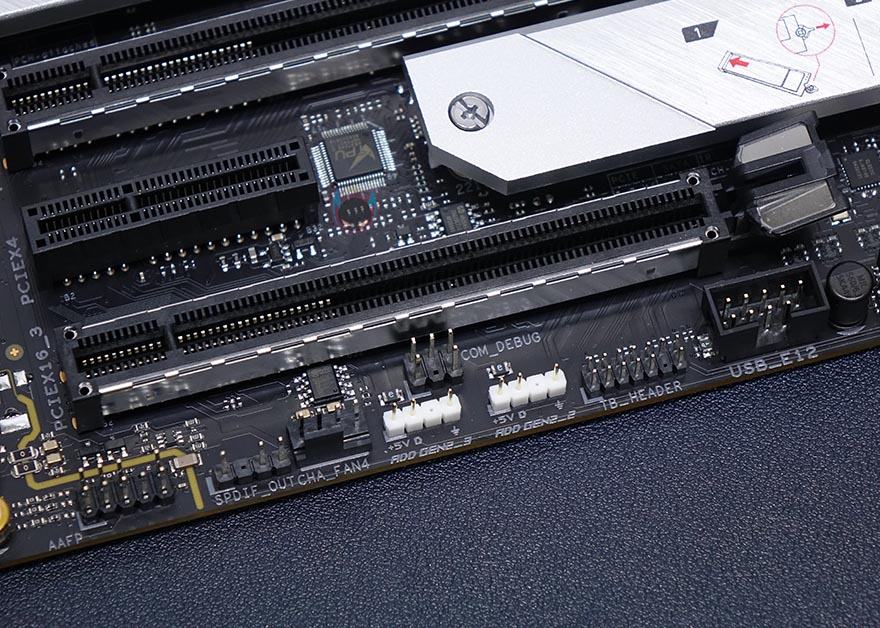 M.2 SSD 슬롯은 총 3개를 갖췄는데, 모두 히트싱크는 적용하고 있으며, 3개 슬롯 모두 길이도 22110까지 지원합니다. 당연히 히트싱크 안쪽에 기본 써멀패드도 부착되어 있으며, 출시 전부터 기대감을 준 Q-랜치도 확인할 수 있죠. Q-랜치는 이번에 메인보드 제조사 전체를 통틀어 처음 보이는 무나사 M.2 SSD 고정 장치로, 랜치를 시계 방향으로 돌리면 M.2 SSD를 고정해주고, 반대로 돌리면 해제가 됩니다. 그리고, 22110 위치에 장착된 Q-랜치를 제외하고, 2280 위치에 기본 장착된 랜치는 나사처럼 분리가 가능하고, M.2 SSD 길이에 따라 위치 장착해서 사용하면 됩니다. 이런 부품 장착의 편리함으로 가장 선도하는게 ASUS죠. 참가로, 이제는 일반화된 PC케이스의 패널 케이블을 메인보드 헤더에 쉽게 연결해주는 Q-커넥터도 ASUS가 가장 먼저 착안했던 겁니다.