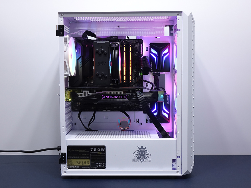 직접, 컴이지 킹덤 클라시코 PC케이스를 사용해 시스템 조립을 해봤습니다. 위에서 언급한대로 요즘 PC케이스 트랜드를 따르는 내부 구조를 갖추고 있기 때문에, PC를 구성하는 기본 부품들로 장착했을 시에 큰 간섭이나 어려움은 없습니다. CPU쿨러 같은경우 타워형쿨러 기준으로 최대 160mm 높이까지 지원하며, 그래픽카드도 외부베이가 없기 때문에 최대 320mm까지 지원하고 있어서 왠만한 그래픽카드들은 다 장착이 된다고 보면 되겠죠. 한가지 주의할 점이라면, 기본 장착된 후면 팬의 연결케이블이 오른쪽(백패널)방향으로 장착되어있는데, 사용하는 메인보드에 아머(Armor) 디자인이 적용되어있다면, 후면 팬의 연결케이블을 윗방향으로 바꿔서 장착해야 간섭이 발생하지 않습니다. 조립 후 PC를 켜면, 앞에서 언급한대로 후면 팬과 전면에 장착된 3개의 팬을 통해 RGB 라이팅효과를 볼 수 있습니다. 따로 LED모드를 갖추고 있지는 않습니다.