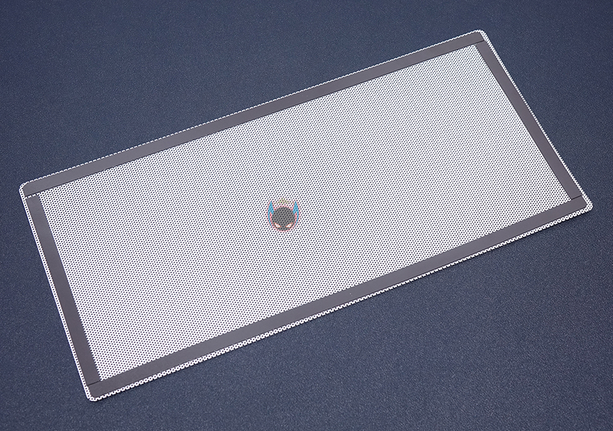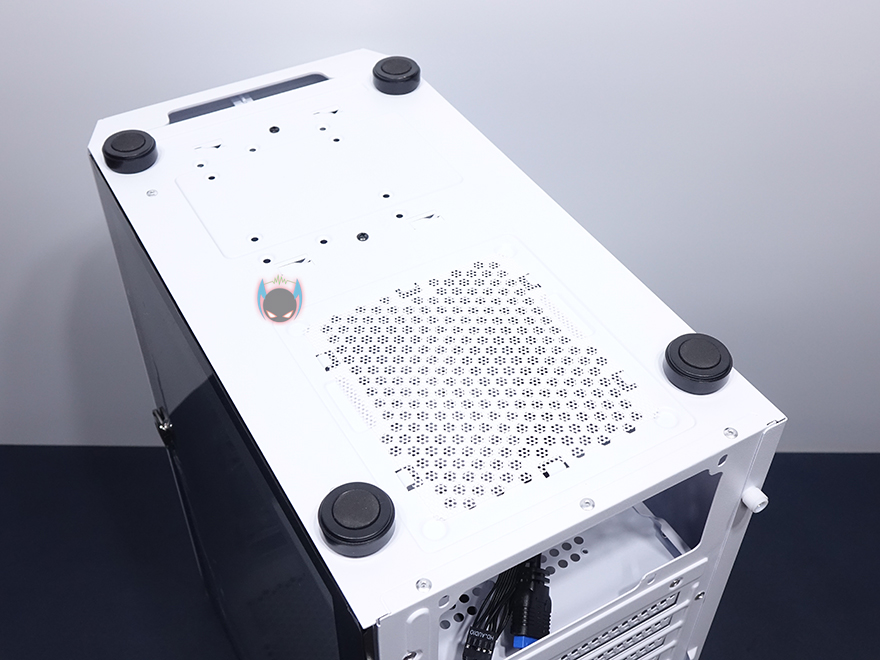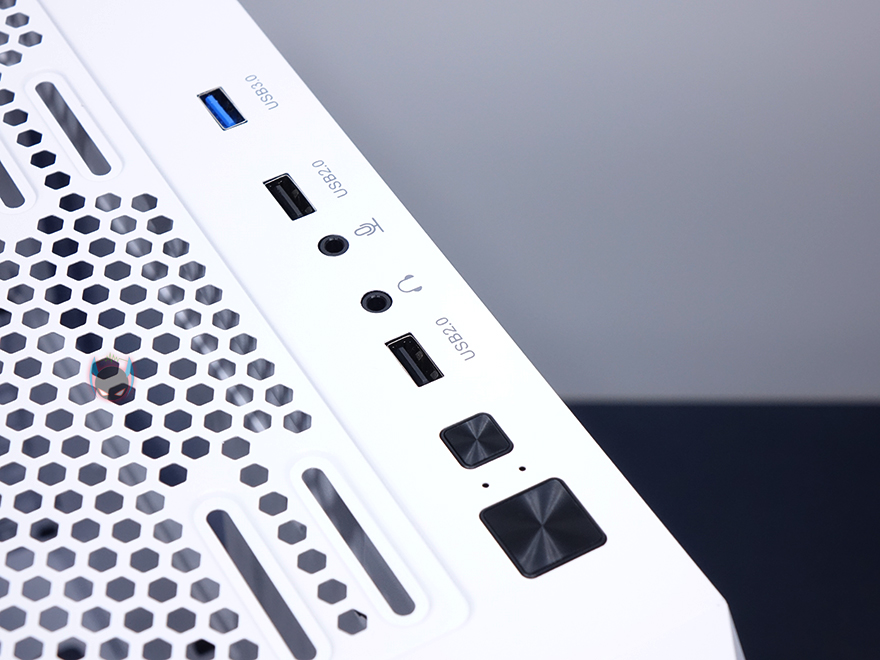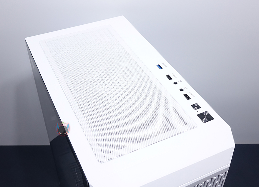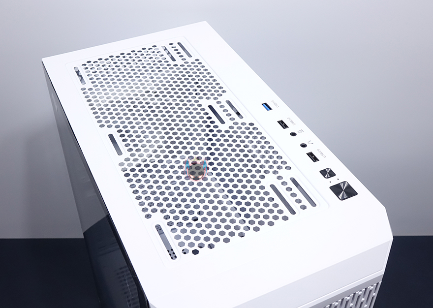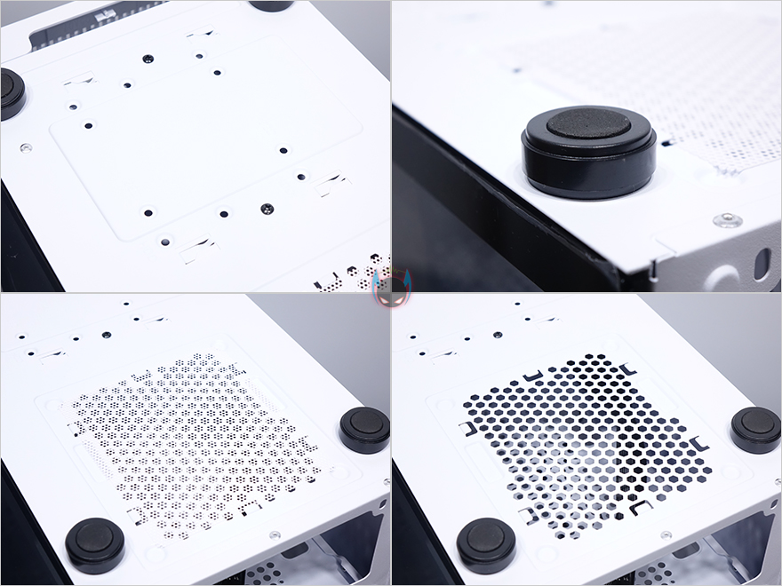 케이스 상단은 마그네틱 방식의 먼지 필터를 적용하고 있으며, 필터를 분리하면 역시 상단 쿨링효과를 위해 메쉬 디자인이 적용된 것을 확인할 수 있습니다. 또한, 상단에도 추가적으로 120mm 팬을 최대 2개까지 장착할 수 있게 나사홀도 적용되어 있죠. 상단 맨 오른쪽에는 앞에서부터 전원버튼, 리셋버튼, USB 2.0 포트, EAR/MIC 포트, USB 2.0 포트, USB 3.0 포트 순으로 버튼과 포트가 배치된 것을 확인할 수 있습니다.