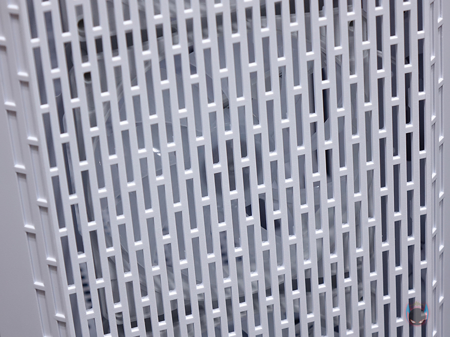 그럼, 컴이지 킹덤 클라시코 PC케이스 외형부터 살펴보면, 제품박스에서 색상구분 표시를 확인했듯이, 색상은 블랙과 화이트 2가지로 출시되었습니다. 컴이지의 킹덤 PC케이스 제품들이 대부분 블랙과 화이트 2가지 색상으로 출시되고 있죠. 전면 베젤은 메쉬 디자인을 적용했는데, 일반적인 원형이 아닌 직사각형 모양의 패턴 디자인식으로 적용을 했습니다. 가까이에서 보면 메쉬 디자인 안으로 내부에 팬이 기본 장착된 것도 확인할 수 있죠. 뒤에서 확인하겠지만, 기본 120mm 팬이 3개 장착되어 있습니다.
