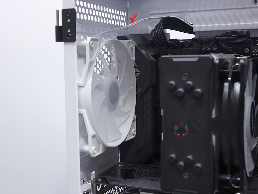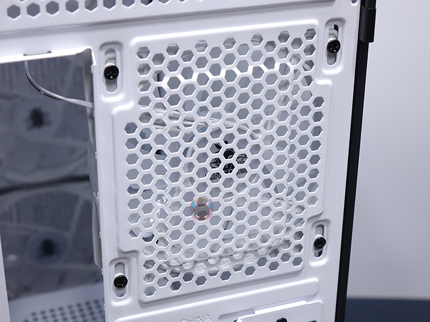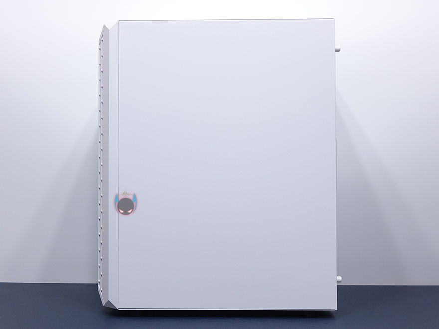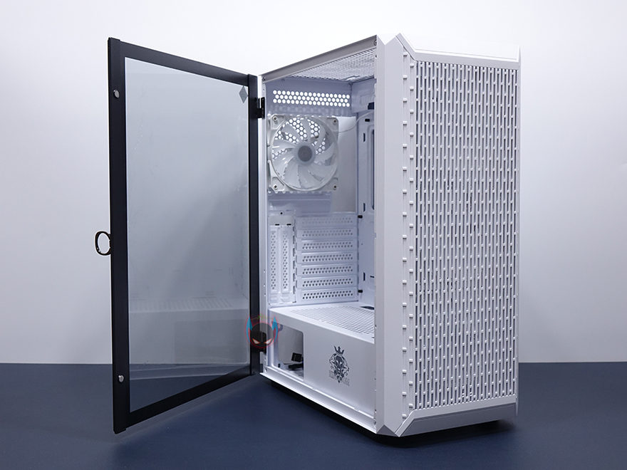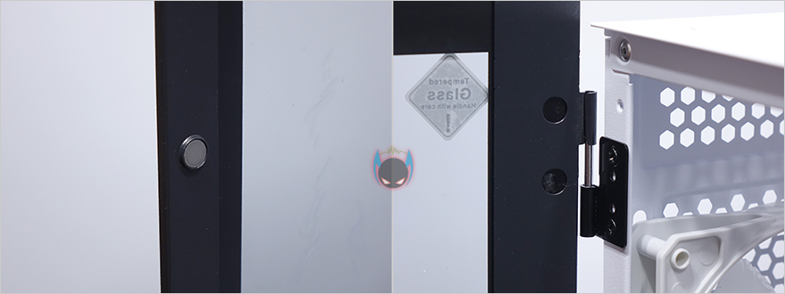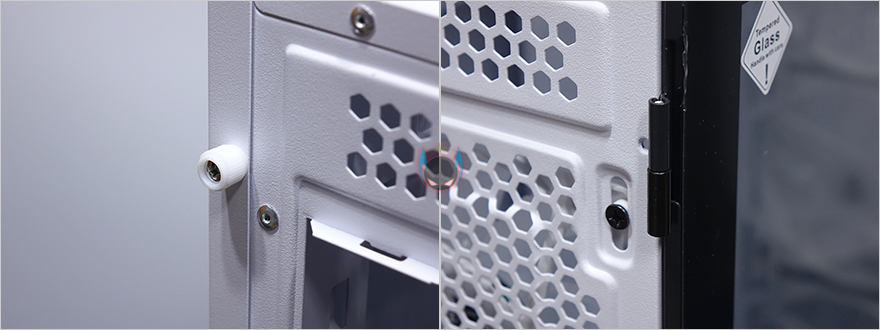 사이드 패널은 전면에서 봤을 때 오른쪽 패널은 기본 샤시 그대로의 민무늬 패널을 적용했으며, 왼쪽 패널은 강화유리 패널을 적용했습니다. 또한, 샤시 패널은 후면에 핸드스크류로 고정했으며, 강화유리는 경첩을 사용해 힌지방식을 적용했습니다. 강화유리 패널은 기본적으로 제품 개봉시 보호비닐이 부착되어 있는데, 사용자 취향에 따라서 제거할지말지를 선택하면 되고, 앞쪽에서 도어 손잡이가 있어서 쉽게 열 수 있도록 했으며, 닫을 시에는 마그네틱 방식으로 안쪽에 자석을 적용해놨습니다. 물론, 열어서 강화유리 패널은 위로 올리면 경첩 힌지부분이 분리가 되어서 패널 자체를 분리할 수 있습니다.