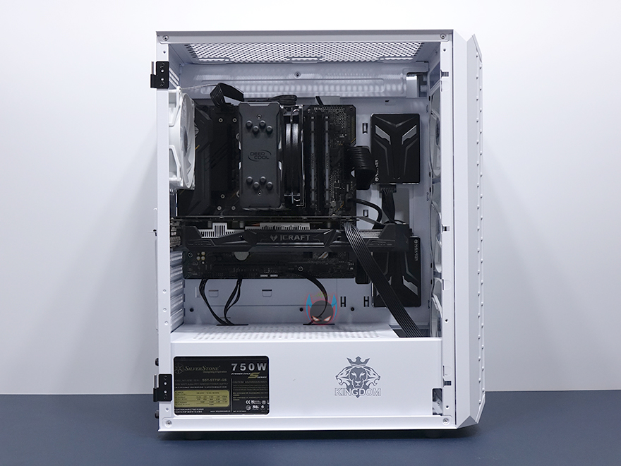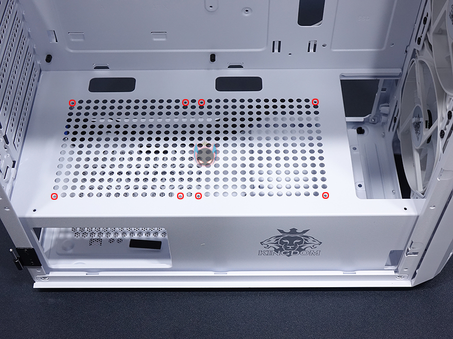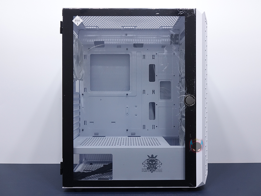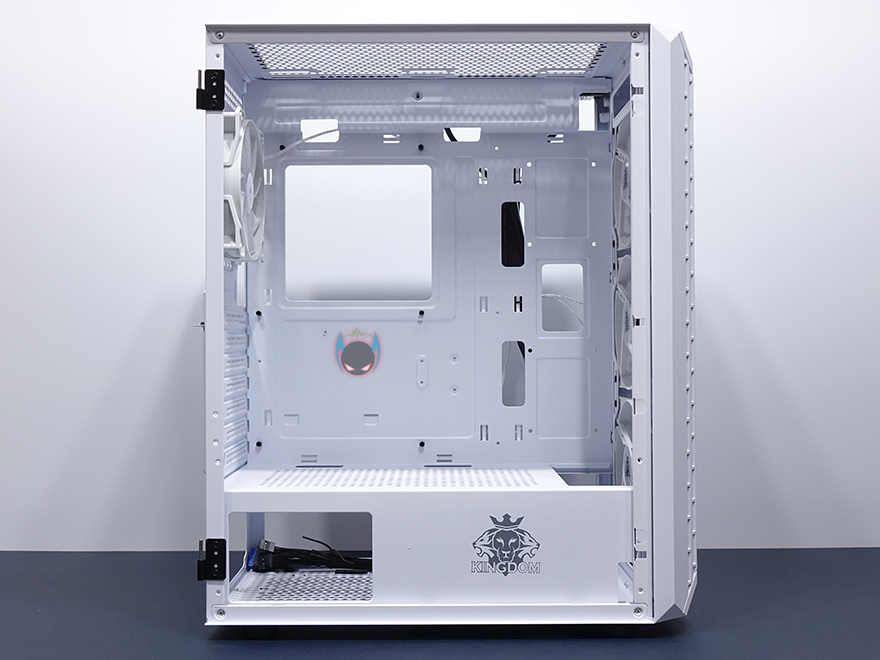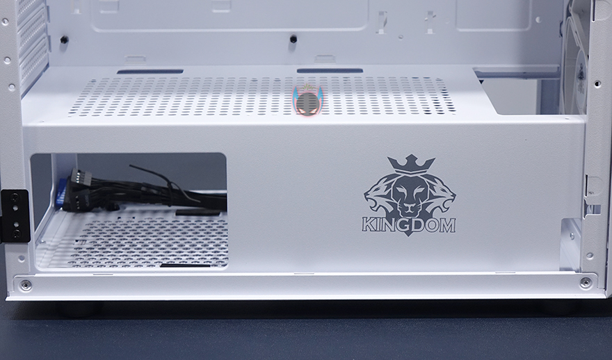 이번엔 킹덤 클라시코 내부를 살펴보는데, 내부는 요즘 케이스 트랜드에 따라 외부 베이가 없는 대신에 내부 공간을 많이 확보하는 심플한 구조를 가졌습니다. 특히, 요즘 미들타워 케이스에서 이런 구조를 많이 볼 수 있죠. 좀 더 자세히 살펴보면, 메인보드가 장착되는 트레이부분에는 CPU-컷-아웃을 비롯해서 주변으로 케이블 정리를 할 수 있게 홀 처리를 해놨으며, 전면 방향으로 트레이 앞부분에 SSD 2개를 장착할 수 있게 지원하고 있습니다. 또한, 요즘 케이스 트랜드답게 파워서플라이를 가리는 하단 커버도 적용되어 있는데, 측면에는 킹덤 로고와 함께 요즘 파워서플라이 제품에서도 RGB라이팅을 갖춘 제품들이 있다보니 완전히 커버로 가리지는 않고 일부 노출이 되게 홀 처리도 해놨습니다. 그리고, 커버 상단에는 에어홀처리와 함께 추가로 120mm 팬을 최대 2개까지 장착할 수 있게 갖추고 있는데, 따로 긴 스크류 제공을 하지 않기때문에 사용자가 직접 팬과 스크류까지 구비해서 사용해야하겠습니다.