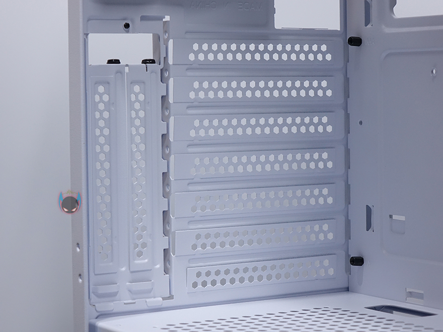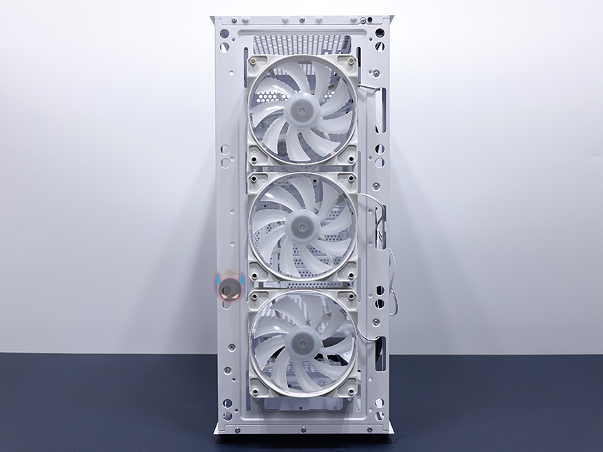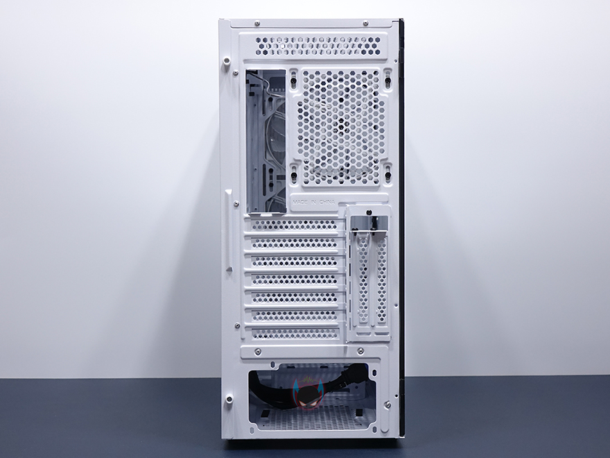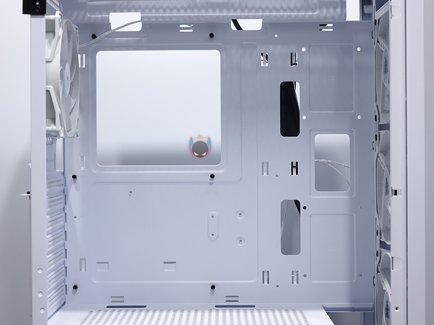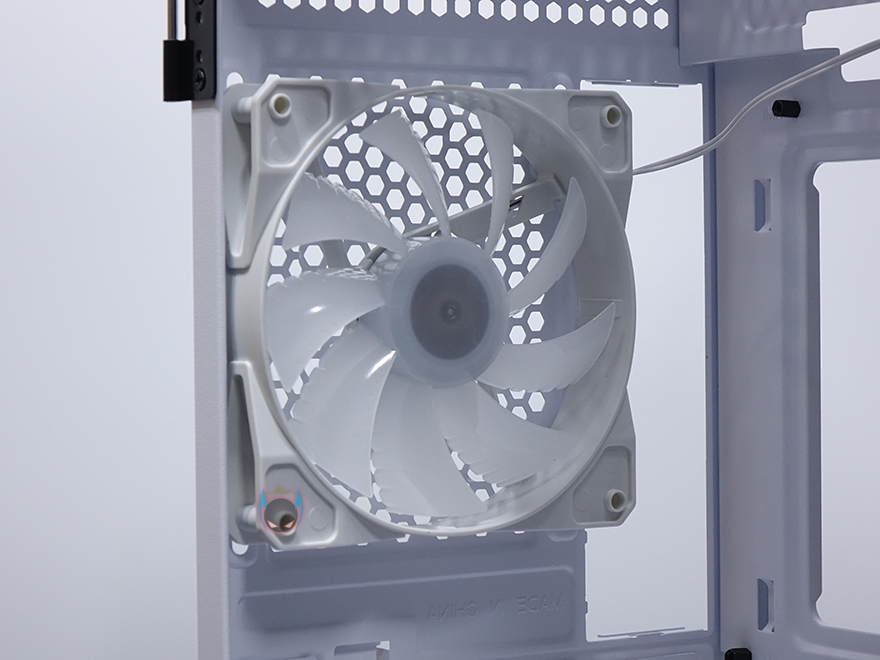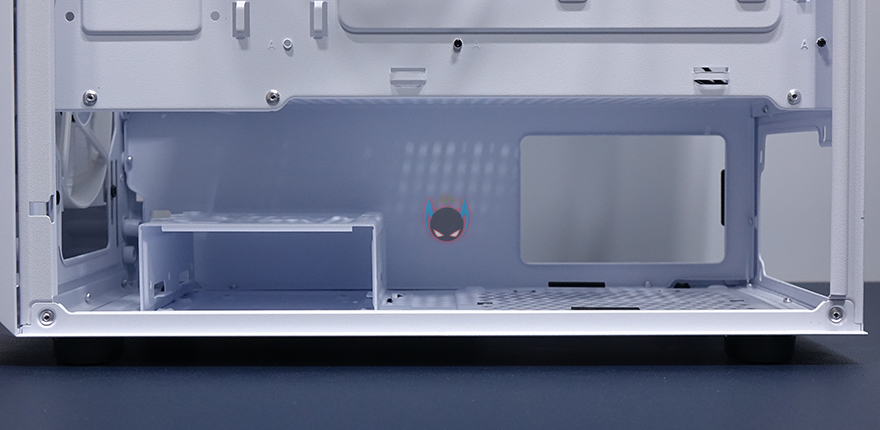 내부 후면에는 외부에서 미리 확인한 배기 역할의 120mm 팬을 확인할 수 있는데, 9개의 블레이드(날개)를 가진 팬으로 케이스 색상에 맞춰 화이트 색상으로 장착이 되어 있습니다. 뒤에서 확인하겠지만, RGB라이팅 효과도 볼 수 있고, 연결방식은 P-ATA 방식입니다. 그리고, PCI슬롯 가이드는 모두 일회용이며, 하단 커버가 적용되었기 때문에 하단 파워서플라이는 전면에서 봤을 때 오른쪽 측면에서 장착할 수 있는데, 자리에는 받침역할과 함께 고무패드가 기본 부착되어 있습니다. 그리고, 앞쪽 자리에는 HDD 전용베이가 있는데, 외부에서 밑바닥부분에 나사로 고정된 것을 확인했듯이, 나사를 풀면 베이 분리가 가능합니다. 또한, 베이 안쪽에는 3.5인치 HDD 1개를 장착할 수 있게, 외부 상단에 추가로 2.5인치 HDD/SSD를 1개 더 장착할 수 있죠. 물론, 베이를 제거한 케이스 내부 자리에도 따로 HDD를 장착할 수 있습니다. 그러니깐 파워서플라이 깊이 길이에 따라 공간확보로 선택할 수 있는 부분이기도 하죠.