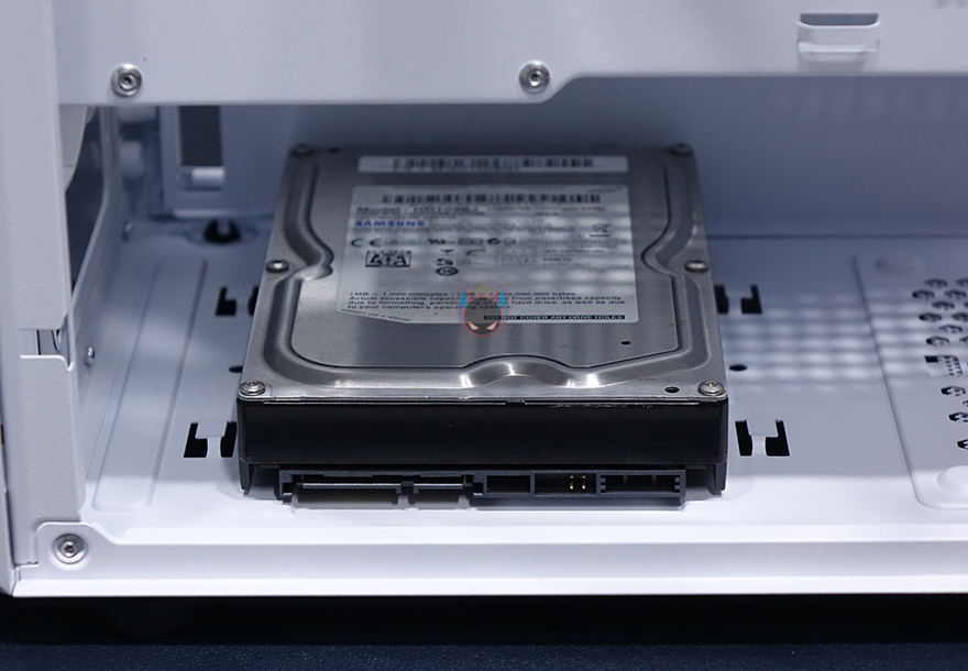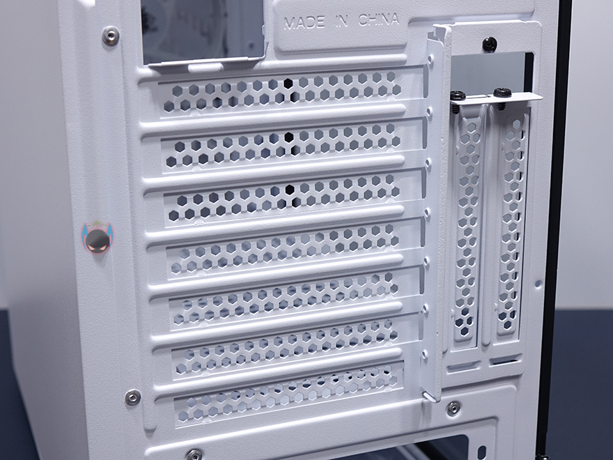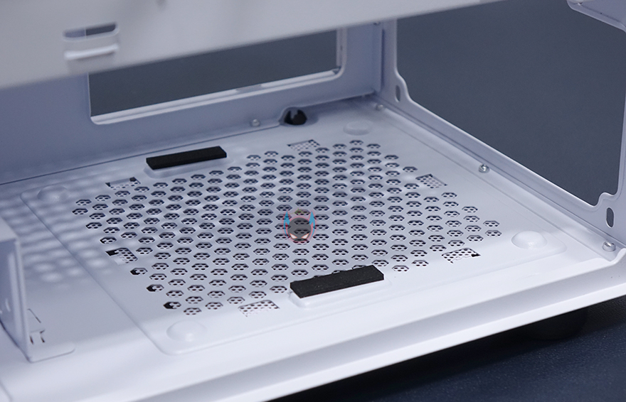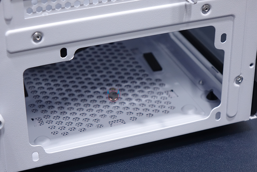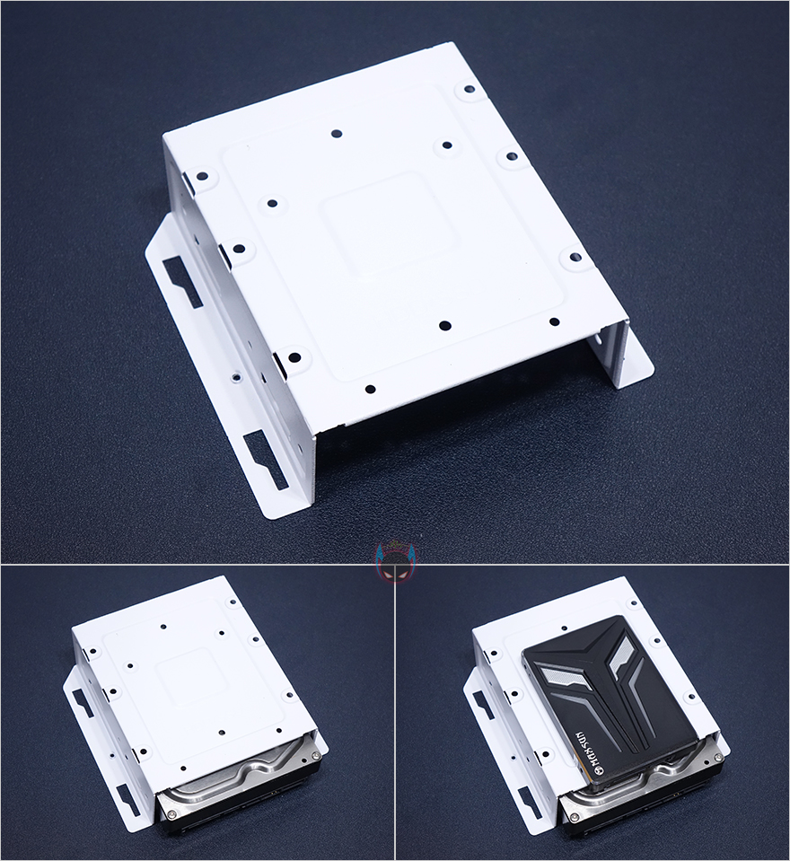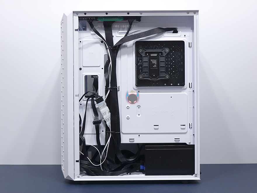 내부 후면에는 외부에서 미리 확인한 배기 역할의 120mm 팬을 확인할 수 있는데, 9개의 블레이드(날개)를 가진 팬으로 케이스 색상에 맞춰 화이트 색상으로 장착이 되어 있습니다. 뒤에서 확인하겠지만, RGB라이팅 효과도 볼 수 있고, 연결방식은 P-ATA 방식입니다. 그리고, PCI슬롯 가이드는 모두 일회용이며, 하단 커버가 적용되었기 때문에 하단 파워서플라이는 전면에서 봤을 때 오른쪽 측면에서 장착할 수 있는데, 자리에는 받침역할과 함께 고무패드가 기본 부착되어 있습니다. 그리고, 앞쪽 자리에는 HDD 전용베이가 있는데, 외부에서 밑바닥부분에 나사로 고정된 것을 확인했듯이, 나사를 풀면 베이 분리가 가능합니다. 또한, 베이 안쪽에는 3.5인치 HDD 1개를 장착할 수 있게, 외부 상단에 추가로 2.5인치 HDD/SSD를 1개 더 장착할 수 있죠. 물론, 베이를 제거한 케이스 내부 자리에도 따로 HDD를 장착할 수 있습니다. 그러니깐 파워서플라이 깊이 길이에 따라 공간확보로 선택할 수 있는 부분이기도 하죠.