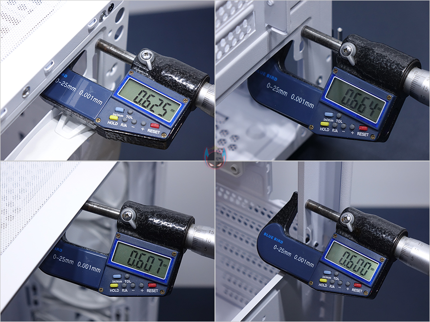 내부 끝으로, 전면 베젤을 분리해 전면 내부를 보면 외부를 살펴볼 때 언급했듯이 120mm 팬이 기본 3개 장착된 것을 확인할 수 있는데, 후면에 장착된 팬과 동일한 팬으로 역시 P-ATA 연결방식이고, RGB 라이팅효과를 볼 수 있습니다. 그러니깐 총 4개의 RGB 팬이 기본 장착된거죠. 마지막으로 킹덤 클라시코 케이스에 사용된 샤시의 두께는 측정해본 결과, 약 0.6mm 대로 다른 제품들처럼 비슷한 가격대에서 많이 사용하는 두께를 사용했다라는 것을 알 수 있습니다.