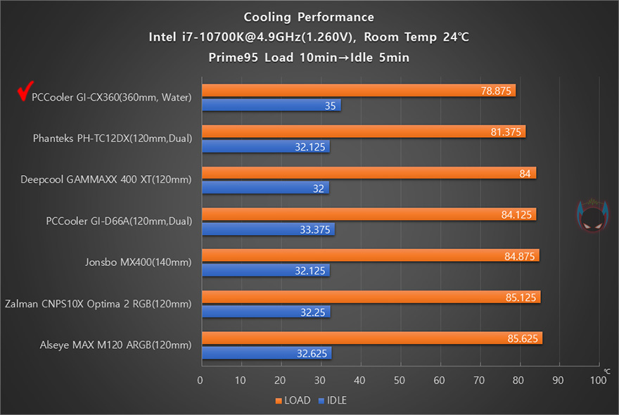 먼저, CPU 냉각성능을 확인해보면, PCCooler GI-CX360 일체형 수냉쿨러가 Load 상황에서 가장 낮은 온도인 것을 보여줍니다. 아무래도 공랭쿨러보다는 냉각능력에서는 수냉쿨러가 앞서는 것은 당연한 것이라고 보면 되는거겠죠. 하지만, 수랭쿨러 같은경우 CPU 주변에 팬이 없기 때문에, 메인보드 전원부에 대한 냉각 영향이 없다라는 단점이 있는데, 이부분은 GI-CX360에서도 그대로 보여줍니다. 물론, 메인보드의 전원부가 잘 갖추고 있으며, 굳이 CPU쿨러의 냉각 영향을 받을 필요는 없습니다. GI-CX360 역시 공랭쿨러보다는 메인보드 전원부 온도가 높지만, 위험한 수준은 아니기때문에, 크게 아쉬운 부분은 아니라 할 수 있겠습니다.