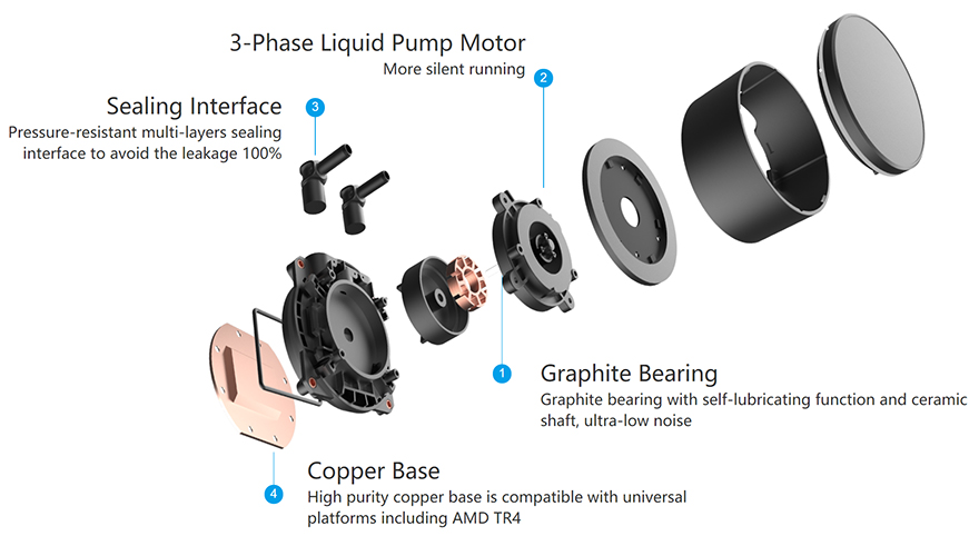워터블록 같은경우 제품 이미지에서 미리 확인했듯이 상판부분은 로고 RGB 라이팅효과를 지원합니다. 그래서, 당연히 로고(Logo) 처리가 적용되어 있으며, 개봉시에는 보호비닐까지 부착을 해놨죠. 제조사 홈페이지에 등록된 제품상세 이미지를 통해 워터블록의 구조를 잠깐 살펴보면, 베이스는 당연히 구리재질 그대로 적용하고 있으며, 베어링은 소음을 최대한 적게 하기위해 흑연이라 부르는 그라파이트 베어링을 사용했습니다. 그리고, 워터블록 높이는 54.3mm이며, 측면에도 라이팅 효과를 볼 수 있는데, 뒤에서 작동확인을 하겠지만, 상판 로고부분은 360도 회전이 가능합니다. 그리고, 워터블록 브라켓과 연결되는 나사홀 부분도 단순히 재질자체에 홀처리가 아닌 내부에 금속 너트를 적용해 결합시 파손이 되지 않도록 했습니다. 이런 부분은 상당히 신경을 잘 쓴 부분이라 할 수 있죠. 또한, CPU와 맞닿는 베이스부분은 구리 재질 그대로 깔끔하게 래핑처리가 되어있으며, 케이블은 3핀 펌프케이블과 RGB 케이블로 구성되어있습니다. 참고로 펌프속도는 2600(±10%)RPM입니다.