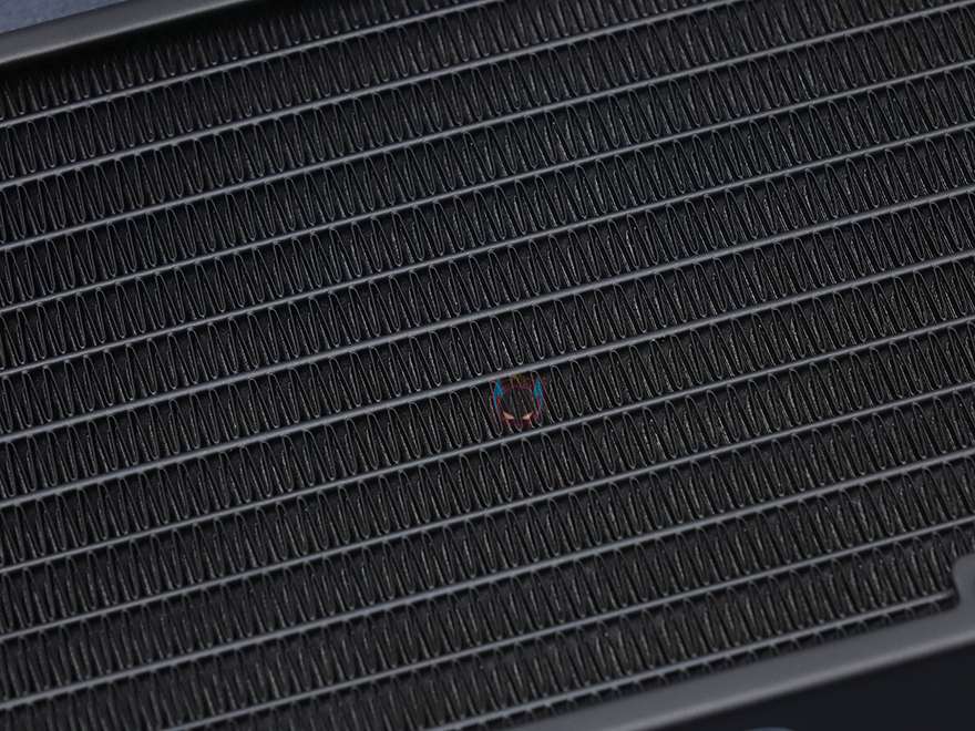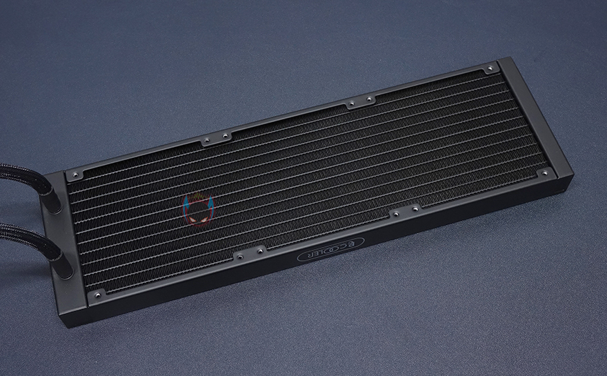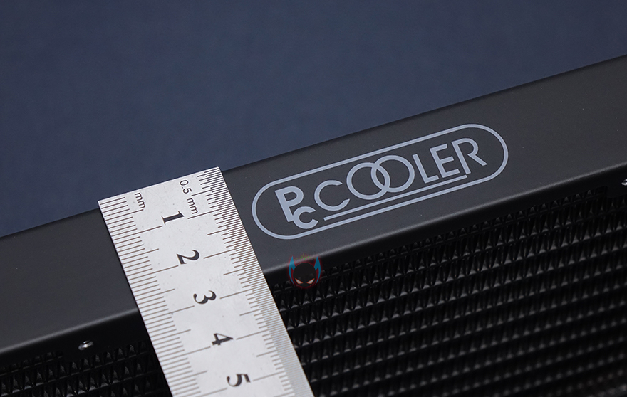 그럼, GI-CX360 일체형 수냉쿨러를 살펴보면, 먼저 라디에이터는 전형적인 360mm 길이로 한면당 최대 3개의 팬이 장착이 되고, 양면으로 모두 장착이 가능하기 때문에, 사용자가 추가로 팬을 장착하면 듀얼-팬 구성까지 가능합니다. 방열핀은 일정한 간격으로 잘 정렬되어 있으며, 두께도 27mm로 전형적인 라디에이터 두께죠. 아, 측면에 PCCooler 로고(Logo)도 새겨놨습니다.
