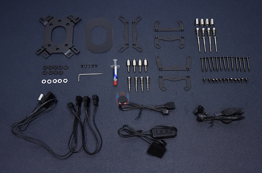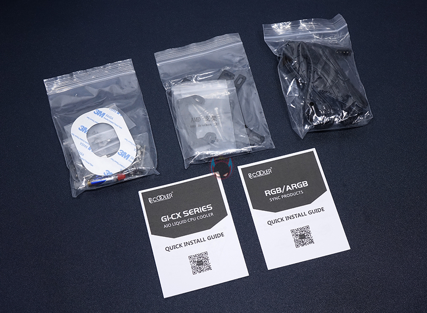 박스를 열어보면, 다른 제품들과 마찬가지로 제품 크기에 맞춘 포장으로 대부분 비닐 포장을 함께 적용하고 있으며, GI-CX360 수냉쿨러와 기본제공 팬 3개를 비롯해, 제품설명서, 그리고 부속품들은 크게 3개로 분류되어 동봉되어 있습니다. 부속품에는 인텔/AMD 공용 백플레이트, AMD 접착테이프, 인텔 브라켓, AMD 브라켓, 공용 너트와 볼트, 와셔, 워터블록 볼트, 렌치, 소량의 써멀컴파운드, 인텔 LGA 2066/2011 전용 나사, AMD TR4 전용 브라켓 및 나사, 팬 나사, 4-in-1 팬 연장케이블, 4-in-1 ARGB 케이블, 5V ARGB 케이블, 자체 RGB 리모컨 구성으로 이루어져 제공해주고 있습니다.