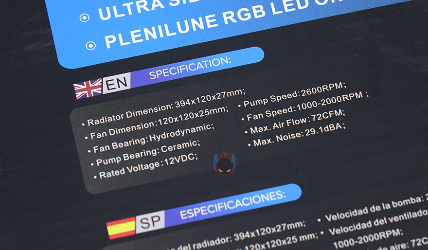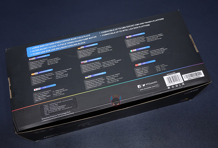 대부분의 일체형 수냉쿨러 제품들이 제품박스에 제품 이미지를 담듯이 PCCooler GI-CX360 모델 역시 제품박스에 제품 이미지를 담고 있습니다. 그래서, 모델명과 함께 기본 제공되는 3개의 팬과 워터블록에서 RGB 라이팅효과가 지원된다라는 것을 미리 알 수 있죠. 물론, 제품 특징으로도 RGB라이팅을 언급하고 있고, 자체 RGB 라이팅 외에도 메인보드의 RGB Sync와도 연동 지원을 한다는 표기도 확인할 수 있습니다. 360mm 라디에이터 모델이기때문에 TDP는 최대 350W까지 지원하고 있으며, 박스 후면에 간략하게 라디에이터 크기와 팬, 워터블록의 사양도 확인할 수 있습니다.