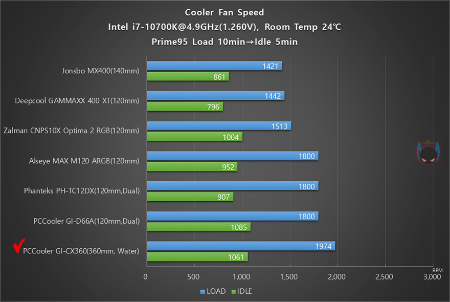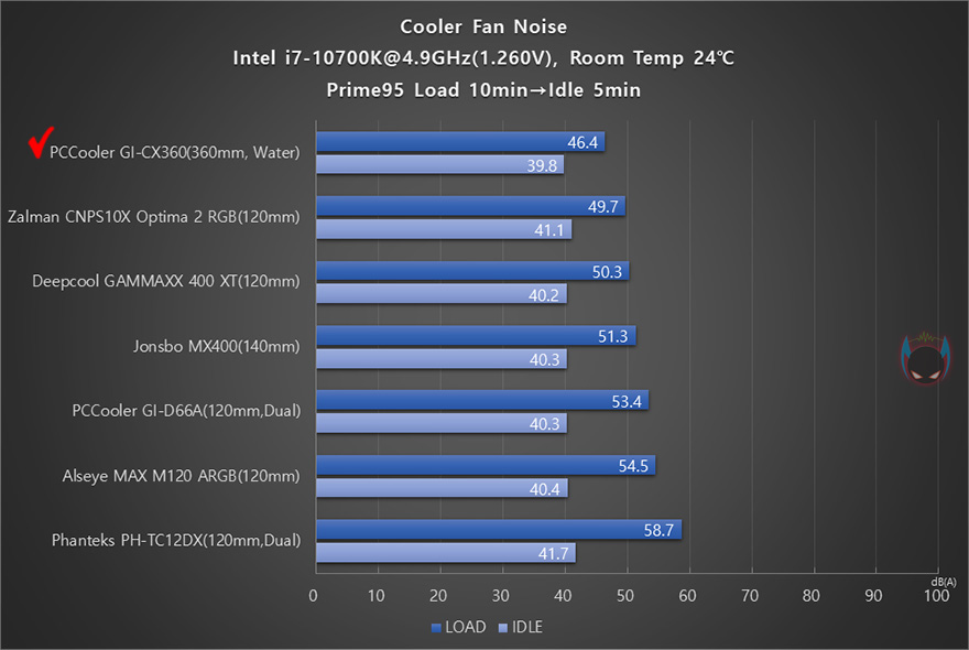 끝으로, 진행하는 동안 GI-CX360 일체형 수냉쿨러의 팬 속도와 워터블록 및 팬 소음을 측정해봤는데, 라디에이터에 장착된 팬 경우 Load과 Idle 각 상황에서 최대와 최저치 속도로 작동된 것을 확인할 수 있었고, 소음 같은경우에는 앞서 언급했듯이, 공랭쿨러와 달리 워터블록과 라디에이터의 거리차이가 있기 때문에, 워터블럭 거리기준에 측정했을 때, 전체 소음이 비교적 낮은 편인 것을 확인할 수 있었습니다. 물론, 실제 PC케이스에 장착해서 사용한다면 이보다 좀 더 낮게 소음이 들릴겁니다.
