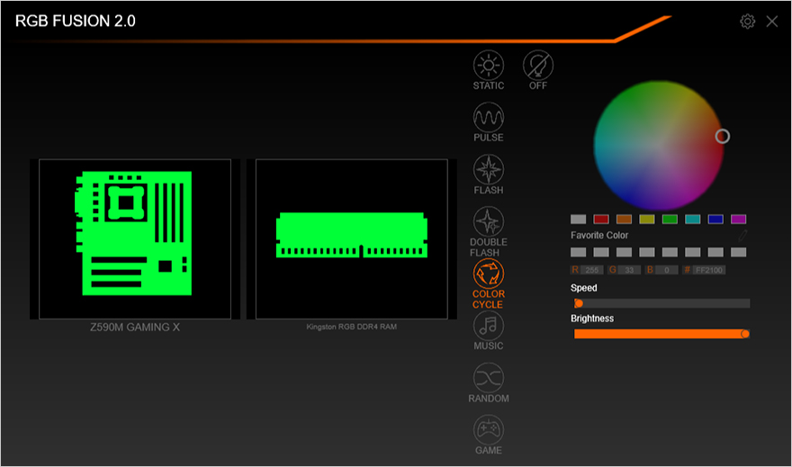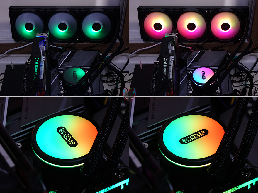 장착 마무리 후, PC를 켜보면 GI-CX360 일체형 수냉쿨러의 워터블록과 라디에이터에 장착된 3개의 팬을 통해 바로 라이팅효과가 작동되는 것을 확인할 수 있으며, 앞서 언급했듯이, 메인보드 RGB Sync 연동 기능이 없어도, 제공되는 RGB 컨트롤을 통해서 다양한 모드전환을 볼 수 있으며, 속도조절과 색상 변경도 가능합니다. 물론, 전체적인 시스템의 RGB 효과를 위해 메인보드 RGB Sync로 사용한다면, 연결한 후에 메인보드 제조사에서 제공하는 프로그램을 통해 효과 설정을 적용하면, 주변 부품들과 함께 동일한 효과로 작동되는 것을 확인할 수 있습니다.