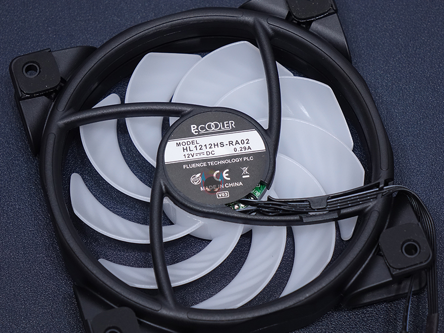 마지막으로 기본 제공되는 3개의 팬은 모두 120mm 팬으로 전형적인 120x120x25mm 규격을 가지고 있습니다. 디자인은 이미 자사 쿨러 제품들에서 흔히 볼 수 있었던 디자인이죠. 블레이드(날개)는 총 9개 구성을 하고 있고, 날개 후면을 보면 풍량을 최대한 높이기 위해 지느러미 디자인을 적용하고 있습니다. 그리고, 팬 장착 나사홀 부위에는 진동소음을 줄이도록 앞뒤로 패드를 기본 부착해놨으며, 역시 RGB 라이팅을 갖춘 팬이기 때문에, PWM(4핀) 케이블과 RGB 케이블로 구성되어 있고, 깔끔하게 슬리빙처리까지 해놨죠. 참고로 팬 사양은 최대 1000~2000(±10%)RPM 속도 범위에 72CFM 풍량, 8~29.1dB(A) 소음을 가졌습니다.