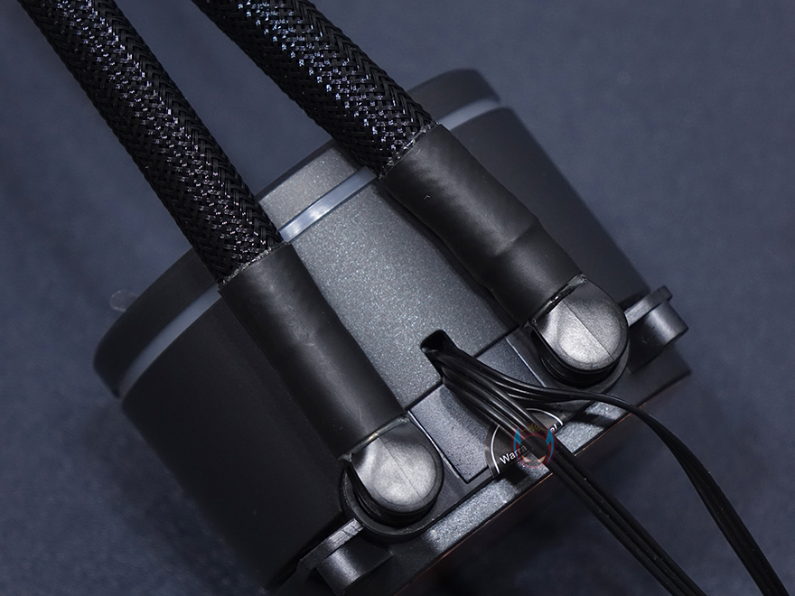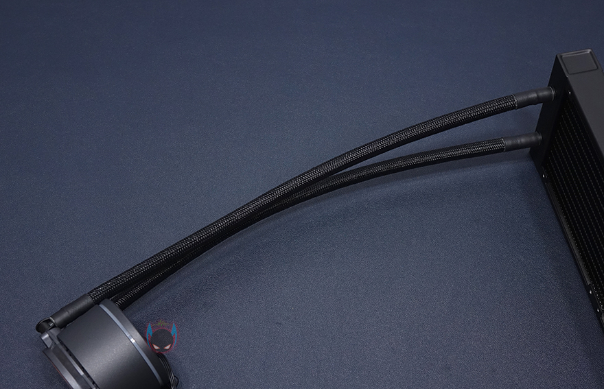 라디에이터와 워터블록을 이어주는 튜브 길이는 400mm이며, 요즘 저가형 제품들도 슬리빙처리는 기본이라 GI-CX360 역시 고급모델이기에 튜브 슬리빙처리는 기본으로 되어있습니다. 그리고, 양쪽 각 연결부처리도 고무 패킹으로 깔끔하게 마무리해서 누수가 발생하지 않도록 해놨습니다.