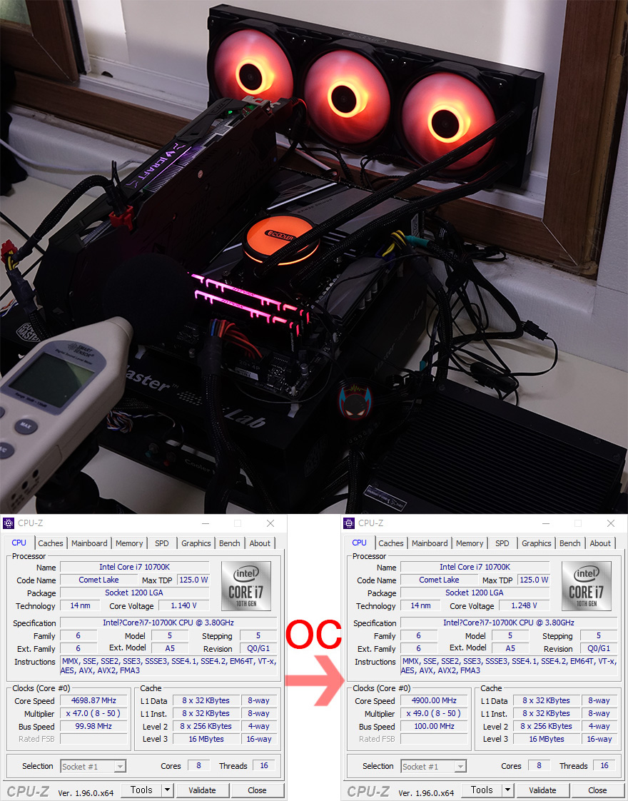 그럼, 이제 PCCooler GI-CX360 일체형 수냉쿨러의 냉각 성느을 확인해봐야하는데, 사용된 CPU는 인텔 i7-10700K이며, 360mm 라디에이터를 갖추고 있기 때문에, 4.9GHz로 바로 오버클럭을 한 상태에서 Prime95 프로그램을 통해 Load 10분을 적용한 후, 5분 Idle로 돌아가는 상황에서 진행을 했습니다. 공랭쿨러와 달리 일체형 수냉쿨러는 팬이 라디에이터에 장착되기 때문에, CPU에 장착된 워터블록과 라디에이터 거리 차이가 있음 참고해야하겠습니다.
