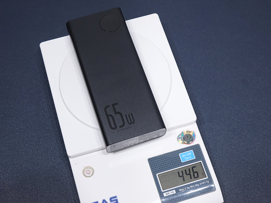 최신 베이스어스 보조배터리(PPADM65) 제품의 디자인을 살펴보면, 제품박스에서 주요 특징을 이미 확인했듯이, 케이스를 풀-메탈 재질입니다. 그리고, 색상은 블랙과 블루 2가지 색상으로 출시되었죠. 크기는 요즘 출시되는 6.5인치이상 크기의 스마트폰과 비슷한 크기이며, 무게는 약 446g으로 사양에 표기된 450g과 비슷한 수치를 보여줍니다. 주머니에 넣고 휴대하기에는 묵직한 느낌이 있지만, 가방 같은곳에 넣고 휴대하기에는 무리가 없는 무게죠.