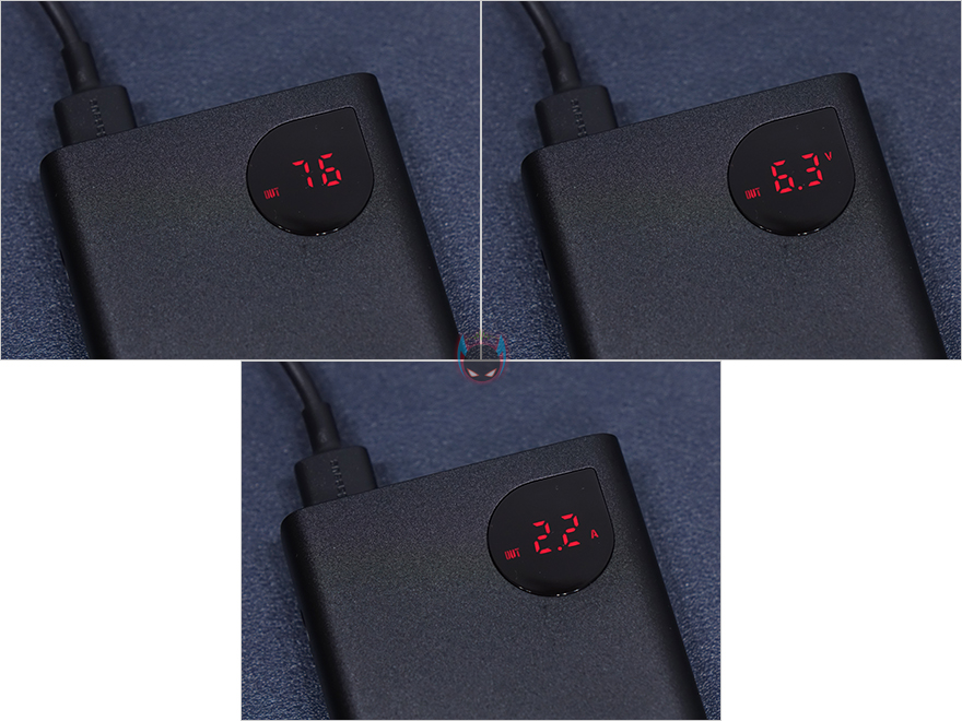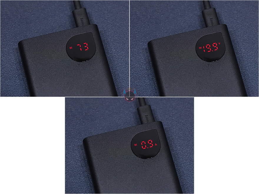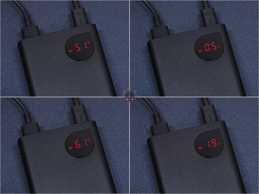 실제로 Baseus(베이스어스) 보조배터리(PPADM65)를 사용해보면, 일단 기기를 연결하지 않은 상태에 전원버튼을 누르면 배터리 잔량을 바로 확인할 수 있습니다. 물론, 단위는 퍼센트입니다. 그리고, 기기를 연결해서 충전할 때 전원버튼은 한 번씩 누르면 배터리 잔량→전압→전류순으로 전환해서 보여줍니다. 또한, 기기 2개를 연결해서 충전할 시에도 포트순서대로 전압, 전류 상태를 보여주고, 배터리를 충전할 때도 잔량과 입력 전압과 전류 상태를 확인할 수 있습니다. 디스플레이는 시야각 영향 없이 어느각도에서도 잘 보이기 때문에, 배터리 작동상태를 확인할 때 유용하겠습니다.