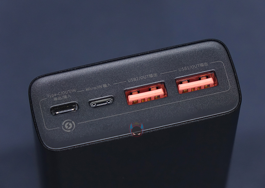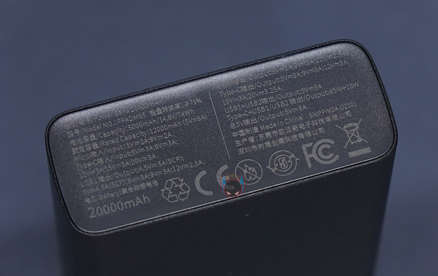 그리고, 이번 제품에서도 LED 디스플레이를 탑재하고 있는데, 시작에서 언급했듯이 Baseus(베이스어스)는 이를 Adaman이라고 부르고 있습니다. 뒤에서 확인하겠지만, 전압과 전류 상태도 보여줍니다. 그리고, 아랫부분에는 다시 한번 65W 고속충전 지원과 20,000mAh 용량 표기를 확인할 수 있죠. 왼쪽 측면에는 전원버튼이 배치되어 있으며, 전면에 USB포트가 배치되어 있는데, 총 4개 포트구성으로 USB 타입C 포트는 입출력 둘 다 지원하며, 배터리를 충전할 때는 최대 60W 입력을, 기기 충전을 할 때는 최대 65W 출력을 합니다. 그리고, 마이크로 5핀 포트는 입력포트로 최대 18W까지 지원하며, 나머지 USB 타입A 1번과 2번 포트는 모두 출력포트로 둘 다 최대 30W를 지원합니다. 그러니깐 출력포트가 3개, 입력포트가 2개 지원되는거죠. 그래서, 2개를 함께 사용할 수도 있는데, USB 타입A 1번과 2번 함께 사용할 시에는 15W 지원, 타입C 포트와 USB 타입A 1번 또는 2번 포트를 함께 사용할 시에는 45W와 18W를 각각 출력지원합니다. 이번 정보들은 제품 밑바닥부분에서 바로 확인할 수 있으니 사용 전 참고하면 됩니다.
