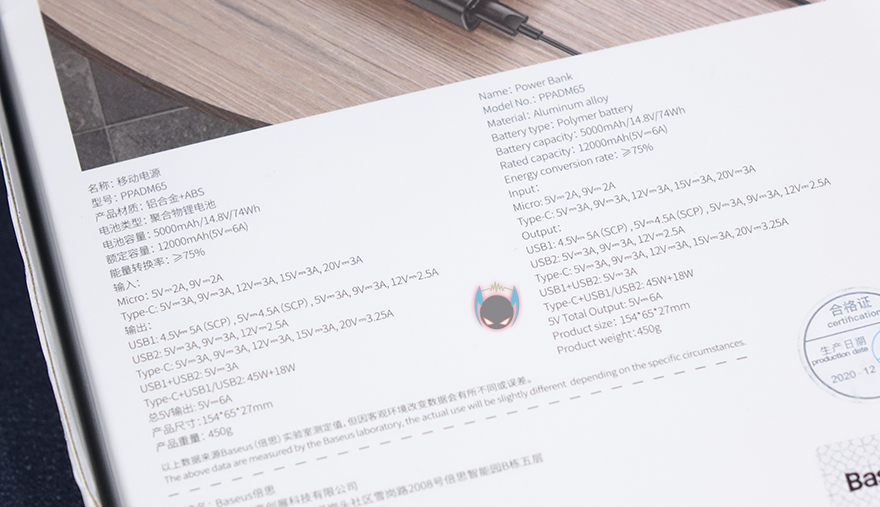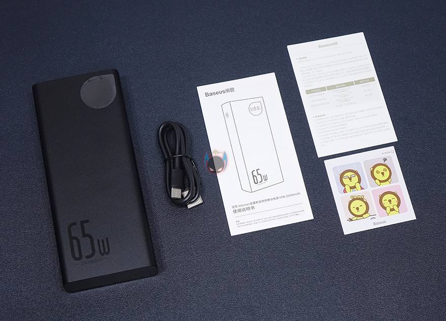 박스후면에는 앞서 만난 보조배터리 제품과 마찬가지로 고속 65W 충전을 지원하기 때문에, 노트북까지 충전커버를 할 수 있다는 연출 이미지를 담고 있으며, 제품의 기본사양 정보도 이미지 아래에서 확인할 수 있습니다. 제품포장은 기존 제품들과 별차이 없이 보조배터리는 비닐에 포장되어 있으며, 보조배터리를 포함한 제품구성에는 USB충전케이블, 제품설명서, 보증서, 스티커 제공으로 이루어져 있습니다. 충전케이블은 USB Type A-to-C 인터페이스를 가졌죠.
