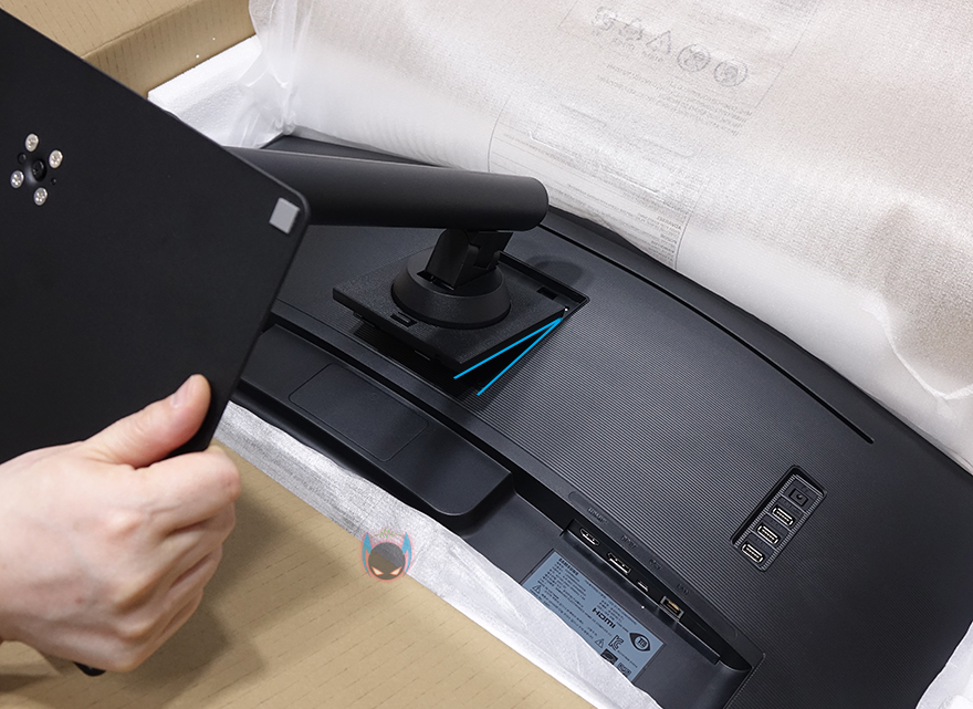 모니터 후면에는 스탠드를 기준으로 왼쪽으로는 중앙위치쯤에 삼성 로고를 적용해놨으며, 그대로 아랫부분에는 전원케이블과 연결되는 포트가 배치되어 있습니다. 그리고, 오른쪽으로는 로고와 같은 위치에 헤드폰 포트와 USB 3.0 포트 3개가 배치되어 있습니다. 그리고, 역시 아랫부분에는 모니터 출력포트로 HDMI 2.0 포트, DP 1.2 포트가 배치되어 있으며, USB Type-C 포트, LAN 포트도 적용되어 있죠. 참고로, USB Type-C 포트는 고속충전 지원으로 최대 90W까지 지원합니다. 그리고, LAN포트 같은경우에는 스마트TV 같은 기능을 해주는 것이 아니라 인터넷 LAN과 연결해서, USB Type-C 포트에 기기를 연결했을 시 인터넷 연결을 도와주는 역할을 합니다. 마지막으로 스탠드 연결부 후면에는 케이블 사용시 묶을 수 있는 고무밴드 홀더장치도 적용되어 있죠.