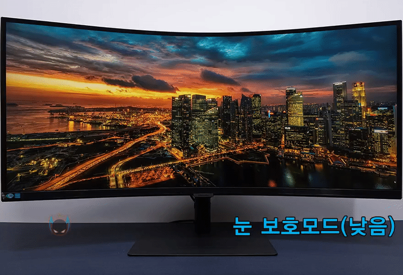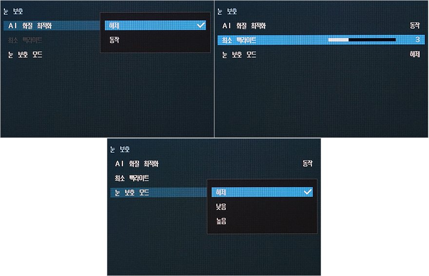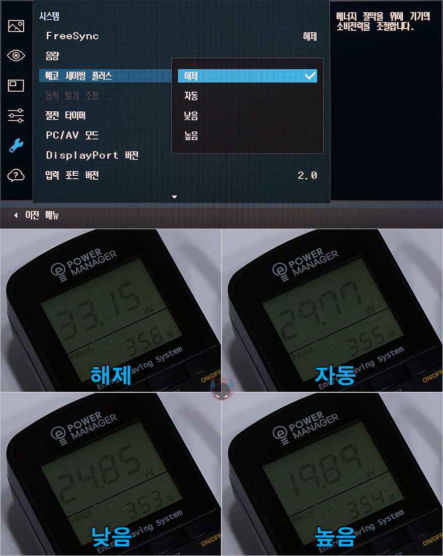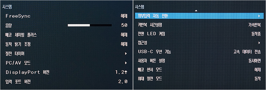그 다음 메뉴인 눈 보호 메뉴에는 AI 화질 최적화와 눈 보호모드 2가지가 있는데, 모두 블루라이트와 관련된 설정으로 시력보호를 해줄 수 있는 기능입니다. 실제로 눈 보호모드를 낮음과 높음으로 비교해보면 블루색상에 차이를 두고 화면을 보여주는 것을 확인할 수 있습니다. 동시화면 메뉴는 앞서 확인했기 때문에 생략하고, 메뉴 표시에선 OSD 메뉴 관련 부분들로 투명도, 위치, 언어, 시간 등을 설정할 수 있습니다. 그리고, 시스템 메뉴에선 FreeSync, 음량, 에코 세이빙 플러스, 절전 타이머, 입력포트 버전, USB-C 우선 기능, 최대 절전 모드 등 다양한 메뉴를 갖추고 있는데, 이 중 에코 세이빙 플러스는 소비전력을 낮춰주는 기능으로, 미적용(해제)했을 때와 자동, 낮음, 높음 단계별로 사용했을 때 실제 모니터 소비전력이 점점 낮아지는 것을 확인할 수 있습니다. 참고로 이 에코 세이빙 플러스 역시 밝기에 차이를 두고 소비전력을 낮추는 겁니다.
