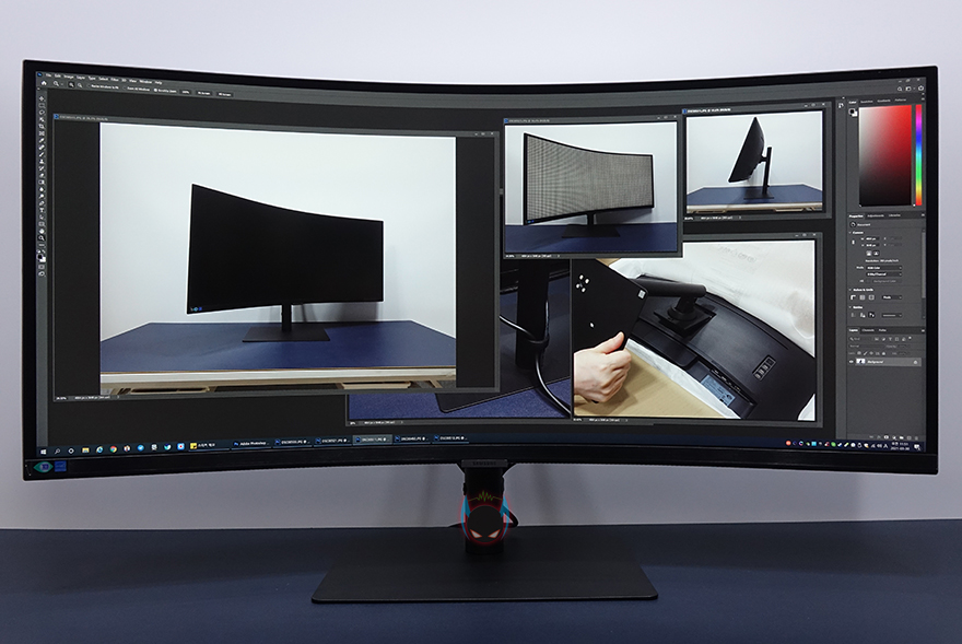 끝으로 실제 편집 작업이나 웹, 게임, 영상 등에서 사용해보면, 34인치 울트라 와이드모니터임에도 1000R 곡면율을 가지고 있어서, 평균적으로 모니터와 거리는 두는 최소 50cm 거리에서도 한눈에 화면이 다 들어옵니다. 그래서, 편집 작업을 할 때는 확실히 넓은 영역을 사용할 수 있어서 작업에 수월함이 있고, 인터넷이나 프로그램 같은 실행 사용 시에도 화면 영역을 나누어서 사용하기에도 효율적입니다. 게임이나 영상 같은경우에는 해당 프로그램에서 비율설정을 할 수 있기 때문에, 21:9 비율로 사용하거나 16:9비율로 사용하는건 선택이라 할 수 있겠는데, 게임은 대부분 화면비율에 맞춰서 최적화로 그래픽설정이 지원되기 때문에 21:9 비율이 어색하지는 않습니다. 반면에 영상 같은경우에는 16:9 비율이 보편적이기 때문에 21:9 나 32:9 비율 같은 울트라 와이드모니터에선 대부분 처음 영상을 봤을 때 퍼진 느낌을 받을 수 있는데, 그래도 S6 S34A650U 모니터 같은경우엔 21:9 비율에 1000R 곡면율까지 있어서 16:9 비율과 비교해서 퍼진 느낌이 크지 않아, 계속 보게 되면 이질감은 크게 들지 않습니다.